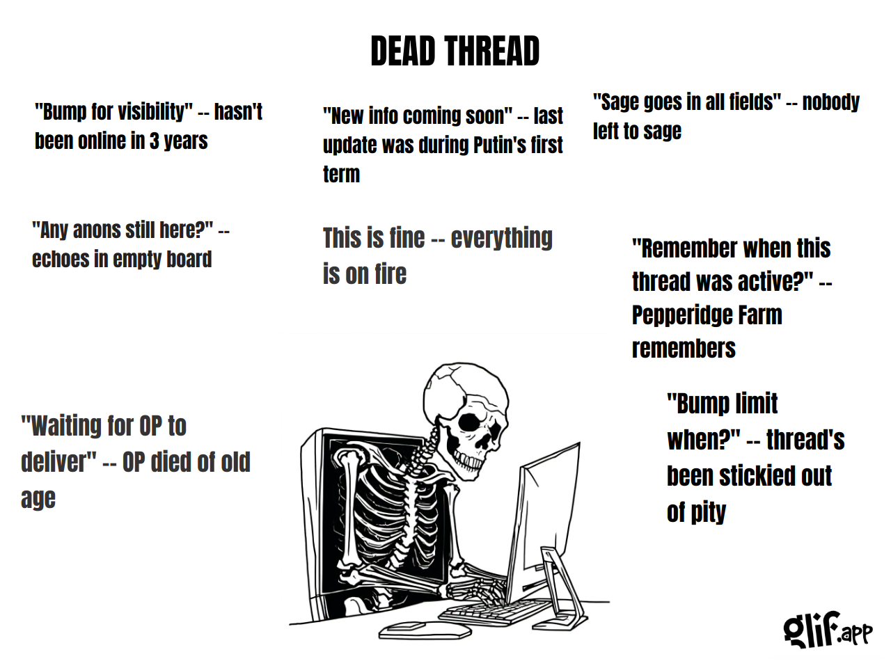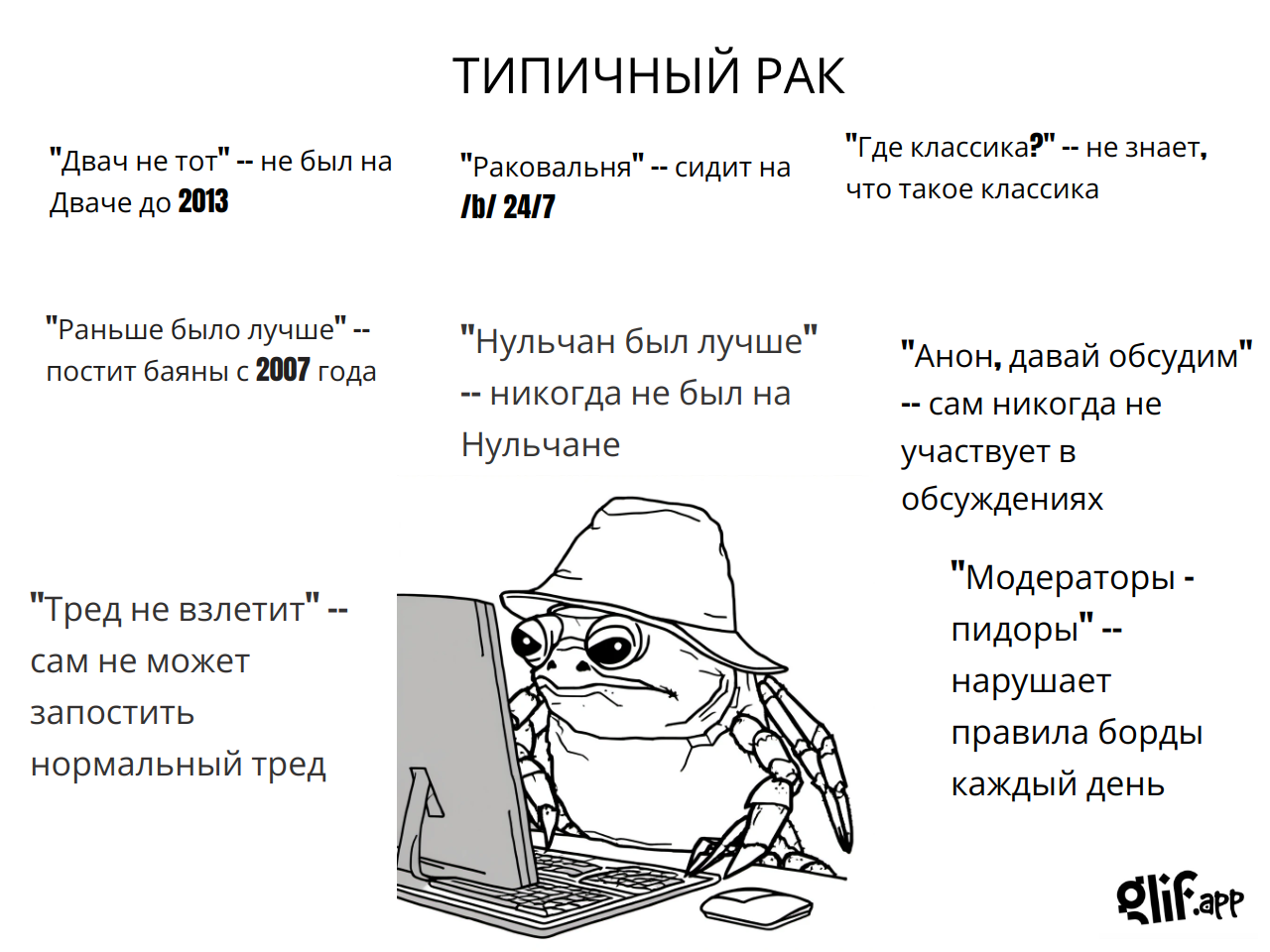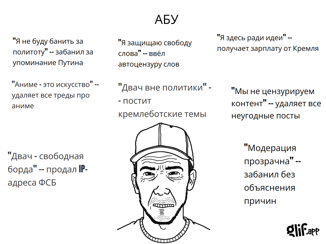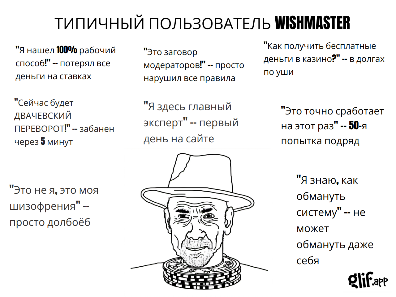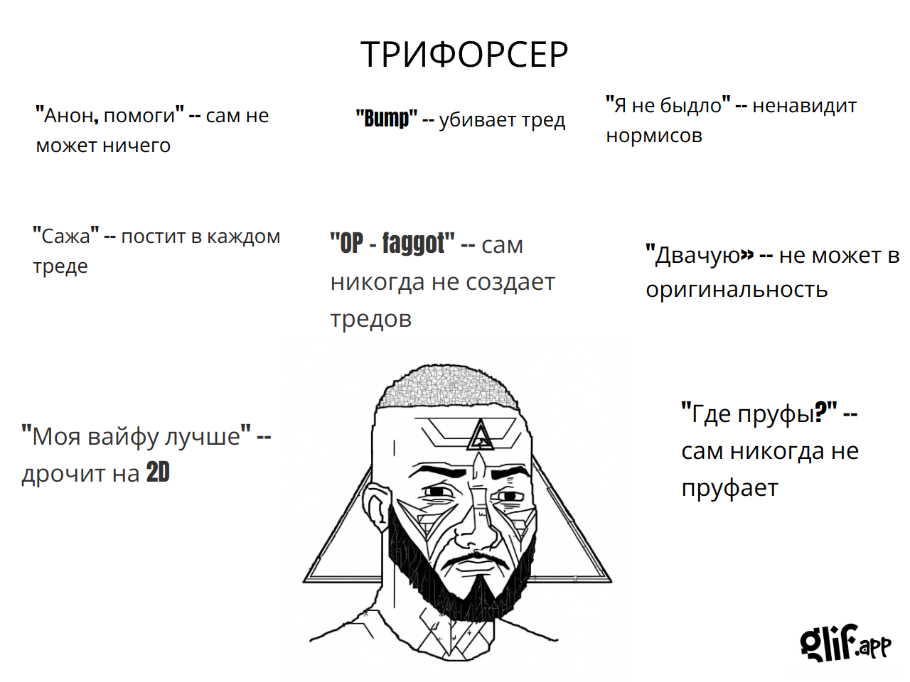— Двач, двач! Мне так больно, у меня кровь течет! За что мне это? — Чем суп ел, дебилушка? — Ножом, конечно. — А ложку не пробовал взять? — Почему анонимусы так безжалостны ко мне, а еще двач-помогач?! Это невыносимо! — Ложку взять не пробовал? — Нет! — А что тебе помешало? — Я не хочу об этом говорить. Всё. Тред закрыт. САЖИ ТРЕДУ САЖИ. Вайп!