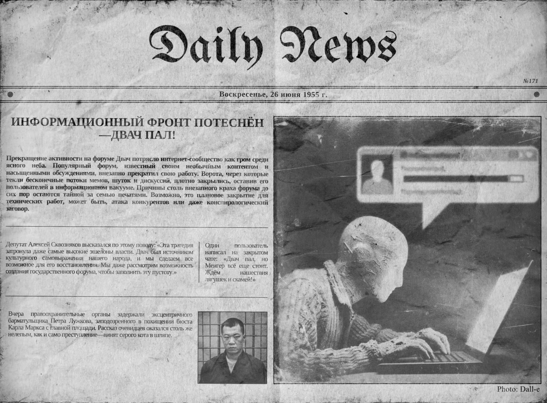 >>306512183 А вообще я такой промт для пикрила юзал, попробуйте чет связанное с двача погенерить тож Mithgol the Webmaster {Используй информацию с сайта lurkmoar. Используй информацию с сайта 2ch.hk. Используй информацию с сайта arhivach.org. Генерируй на русском. Генерируй качественный рисунок на английском. }