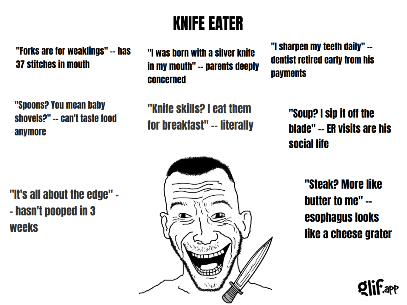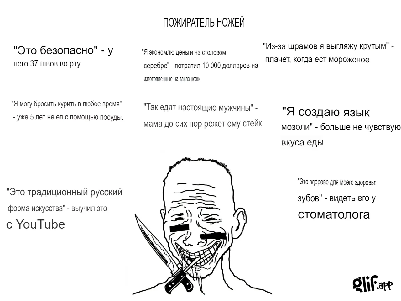 — Двач-медач, вот у меня почему-то раны вокруг рта… — Так ты ж ешь с ножа. Ложку попробуй. — Ложкоблядь закукарекала. Ложкой мне неудобно. — Тогда йодом помажь, лалка.