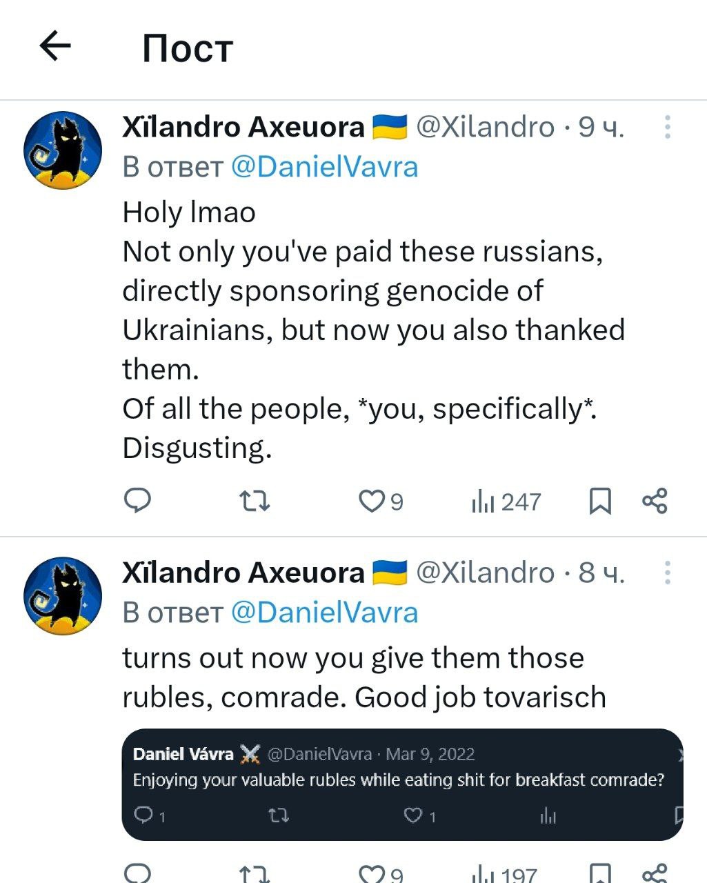 >>9366003 Это очень прекрасно что вся эта восточноевропейская шелупонь имеет возможность публично высраться в твитере и из-за трампа не боится этого делать. Доводилось как-то наблюдать ютуб-перебранку представителя чикагской афроамериканской интеллигенции с румынским ютубовским косноязычным фашиком, это было великолепно настолько что описать нельзя.