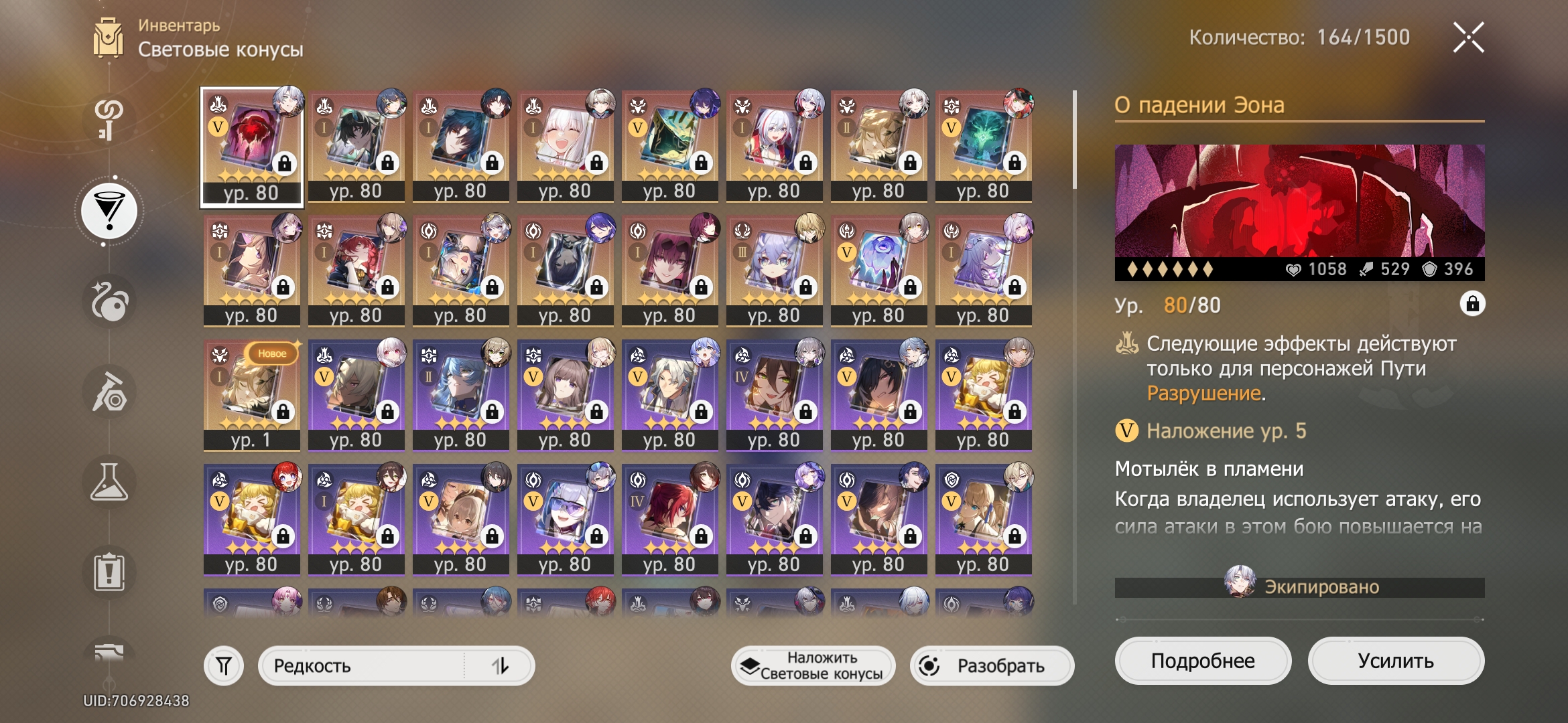 Конусы берёшь в зависимости от персов, которых имеешь. Падение Эона (разрушный конус, на Фаенона и на 9 из 10 разрух очень сильный конус, уступает только сигнам, и то не так много) Круиз - охоте керри, тоже очень хороший конус. Сохранение - посредственный, так как усиляет только самого танка, баффы пачке не даёт, ну и самих сохранений очень мало в игре, большинство параша просроченная. Нигилити конус каловый, он типа ок, но 4 стар аналоги лучше. Эрудиция - посредственный, но можешь сунуть кому. Проблема в том, что на мини герту конус бесплатно за виртуалку дают, Сервал этот конус так себе. Конус на память бис конус для гг памяти и Гиацине, если сигны нет. Другая память в игре - это керри, этот конус саппортящий.