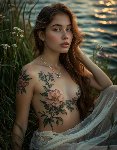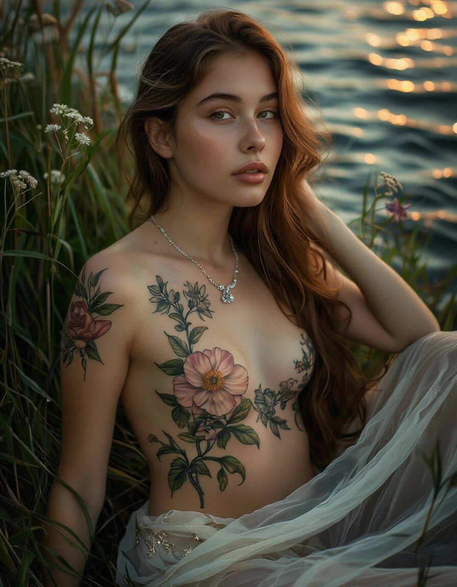 профессиональное фото; люминесценция в природе, цветок тату с живота и проходит по левой bust; брилиантовое колье, красивая девушка лежит в высокой траве у воды; цветок растёт у воды; справа с плеч к низу живота стелится полупрозрачная вуаль Шедеврум 2.7