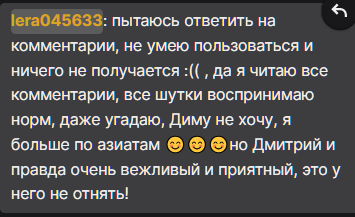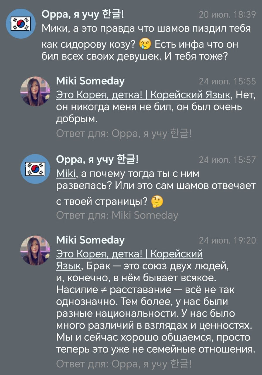 >>481117 > Сколько на неё подписан, ни разу не видел чтобы она кому-то отвечала >А тут понимаете ли расписала всё таким сообщением >Шамов О нет, он раскрыл план Шамова, сначала долго никому не отвечать, а потом ответить на русском и очень подробно! А на самом деле Шамов уже давно убил свою жену японку и Мики это только аккаунты в социальных сетях.