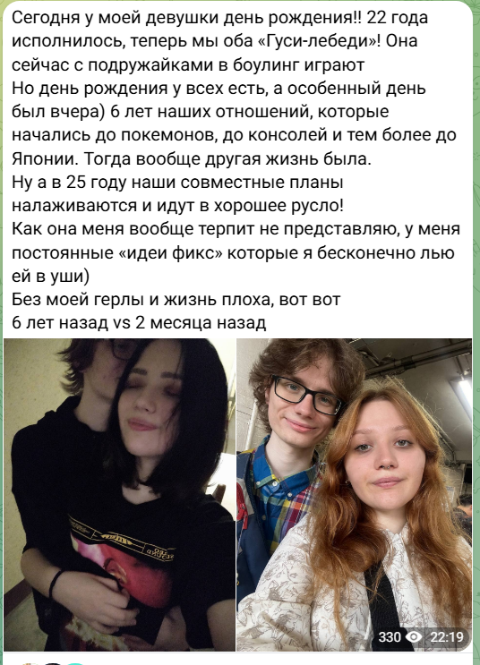 Он так говорил. Но по факту я слышал об испытательном сроке каком-то, мб она и утвердила его уже. По итогу всё развитие заключается в хождении и перекату части зрилой на канал гаку сру. В голову лезть к душевно больным такое дело, хз что утам у них за планы. Но сдаётся мне, что елена всёрьез не верит селюку и не даёт доступа к другим сеткам,просто он говорил о роли полноценного смм во всех социлках но ждёт конвертации со стримов в ученички/туристы. хз короч) не забываем что лысое рэгало любит пиздеть