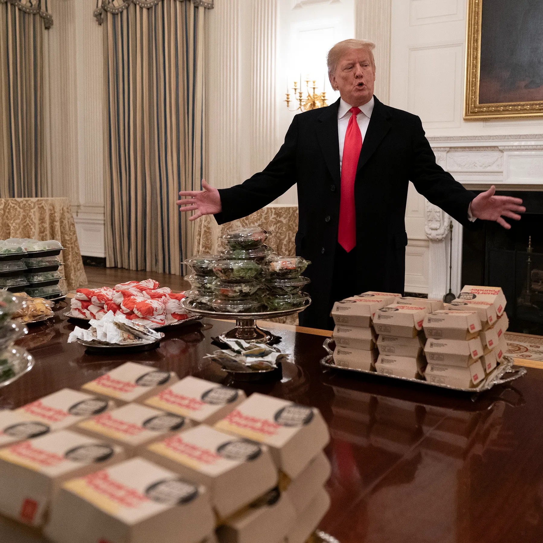 >>323599909 Охуеть ты вскрыватель. Да, внатуре они не каждый день там из мака питаются. Обычно что-то более дорогое и это не держат в секрете. Но в тот день был шатдаун правительства и на приёме были молодые спортсмены, Трамп сказал, а давайте бургеры закажем, молодёж это любит. Спецом ли он это сделал? Да, спецом