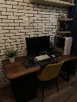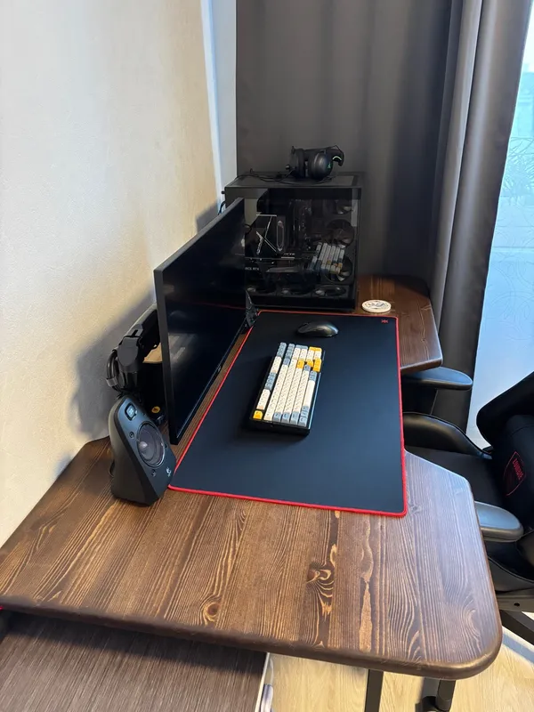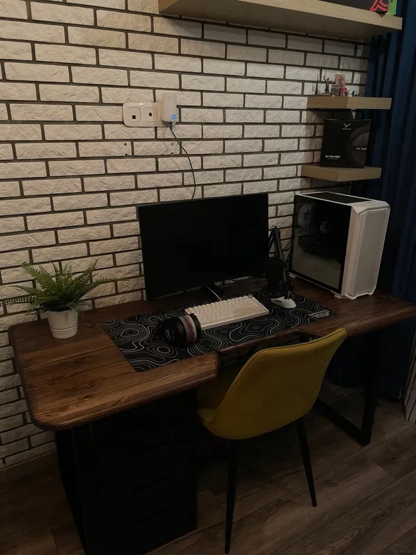 Почему одни углы скругленные, а другие острые? Сам стол выглядит брутально, слишком большой радиус скругления не в кассу. Алсо проиграл с круглых розеток - все то же самое - в квартире всё уловатое - кирпичи, полки, монитор - а розетки почему-то скругленные. Наши люди вообще не умеют в дизайн.