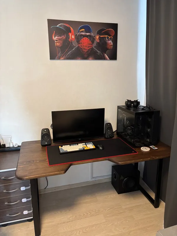 Стол усредненного сыча - из лдсп/мдф размером 80x160см, чтобы хватило места и барахло свое по столу разложить, и мониторы расставить, и жрать за ним. Собрать такой можно изи самому: столешница на маркетплейсах стоит 2-5к, подстолье (ножки) стоят 2-3к. В сумме выходит меньше 10к за стол.
