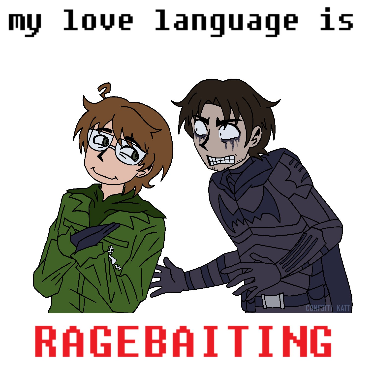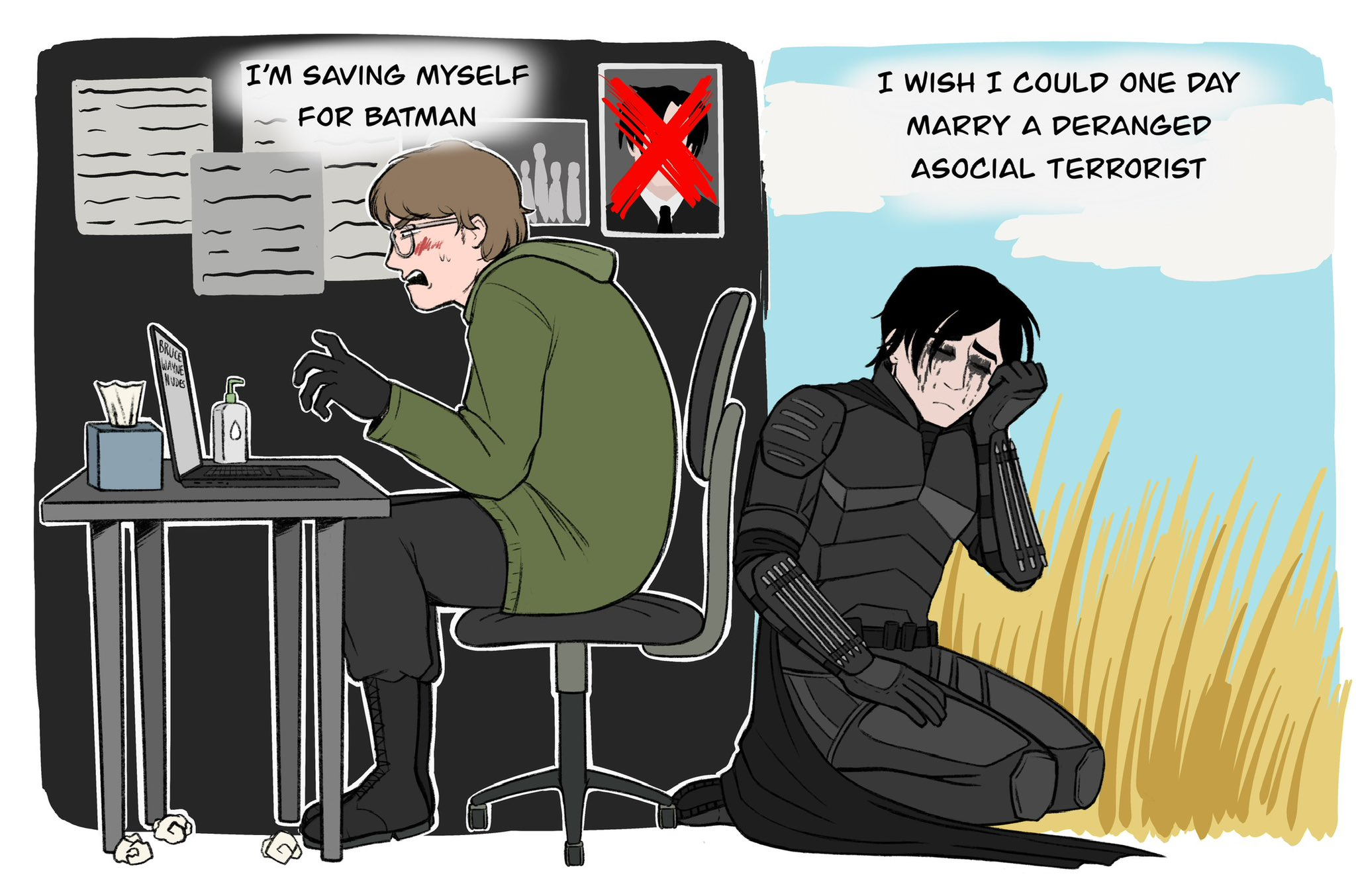 Блин, мне срочно нужно коммьюнити по бэтфэмили, я уже не могу. Пинтерест меня просто бесит. Под каждым очевидным джейдиком там коммент-оправдание от блаженных типо: хихик НАСТОЯЩИЕ братья! Как они друг друга любят ПО-БРАТСКИ. Да еб твою мать, дик его на арте в губы целует, пока джейсон его на руках держит, что здесь братского? Или другая крайность, возмущаться под каждым (реально под каждым) артом: ОНИ БРАТЬЯ вы знали они братья? При этом канонично у тима отношения со стефани, а у дика с барбарой. То есть, если ты девушка, то похуй