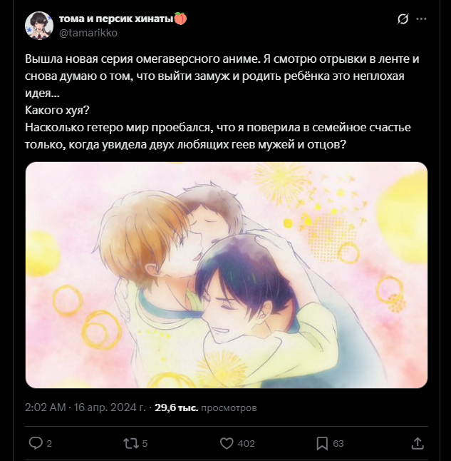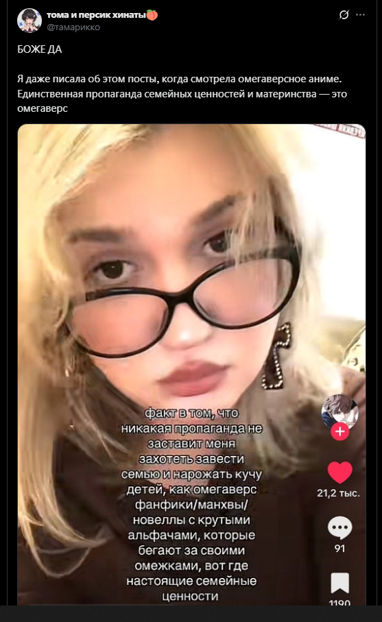 А меня прикалывает в омегаверсе вся эта животная тема с течками, феромонами и метками, но когда начинается тема оплодотворения детей и родов через очко мне хуево становится