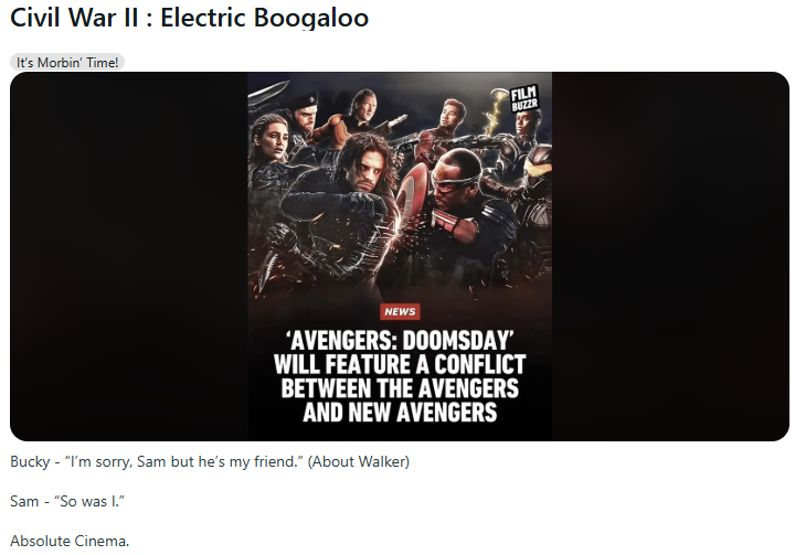 >>6299409 Эх Тони ну что это такое, какое предупреждение, что это за нерешительность... кэп точно знал за что дрался и не сомневался и предупреждения не давал