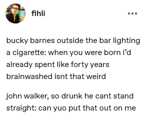 >>6305808 >у меня похожий отвал доверия происходит, когда вместе автор свои интересы выдаёт за интересы персонажа О, это тоже бывает. Нет большего кринжа, чем персонажи, смотрящие гарепоттера и обсуждающие, кто из них на каком факультете. Или персонажи, у которых в каноне способ приведения нервов в порядок - это напиться водки и разбить кому-то морду, в фике читают лекции про психотерапию и осознанность.