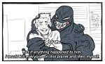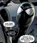 Насчет сына, про него никто знать не знал, Эдди его принял за сводного брата. А симбиот при первом столкновении понял, что это сын Эдди, и что у него есть способности общаться с ульем, что он возможно тоже симбиот. И симбиот испугался, он подумал Эдди теперь бросит его, если узнает, что Дилан его сын. Симбиот начал путать его сознание, манипулировать, чтобы удержать Эдди при себе. Никакой прямой реакции симбиота в этом комиксе не было, он сначала его боялся, а потом принял как их семью, но он его воспринимает как ребенка Эдди, не как своего ребенка. И в конце серии Эдди и симбиот больше не вместе, Эдди освободил его от улья, а сам ускоренно стареет, он седой и использует трость, так как он заменил главу улья симбиотов и все его жизненные силы уходят на управление ульем. А симбиот водит пездюка в школу, защищает его и в конце концов они сливаются, пездюк новый веном