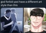 Но это кмк не имеет никакого отношения к яою, когда есть пассив-шкаф и актив-шота. Тут сразу по их внешности ясно, кто кого будет ебать, и именно это кажется скучным, потому что это литералли гет, только у женщины тоже есть хуй.