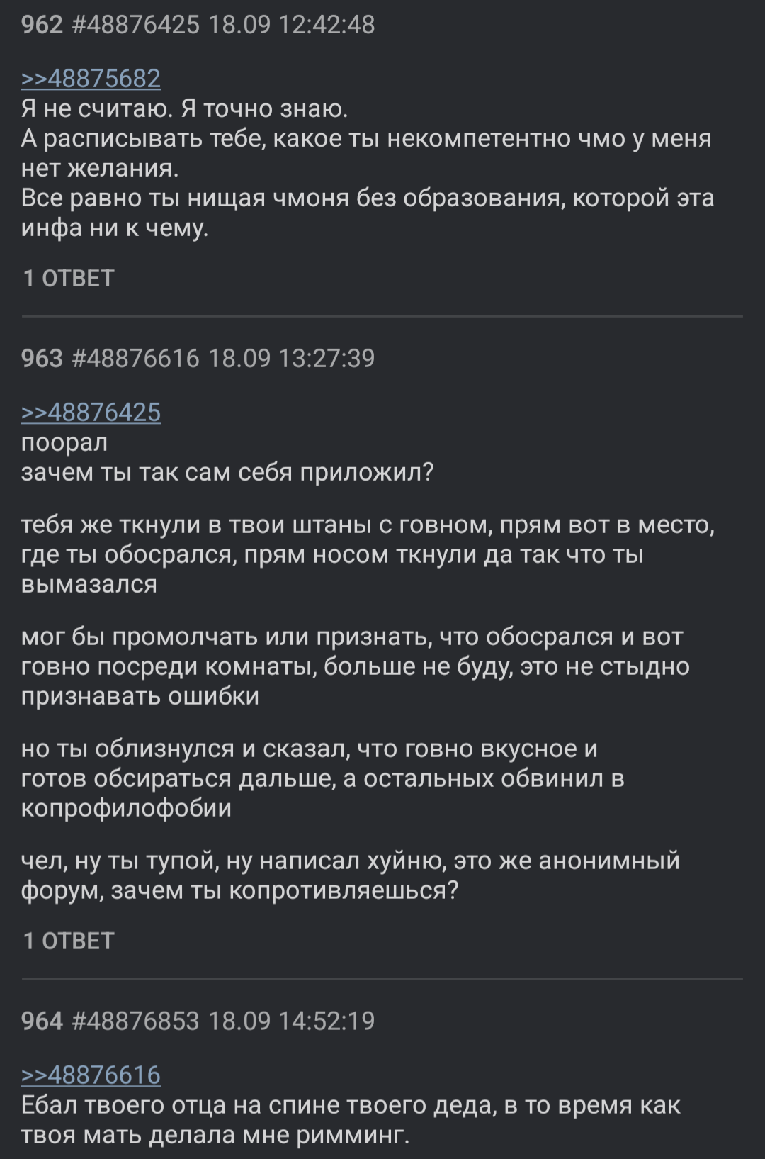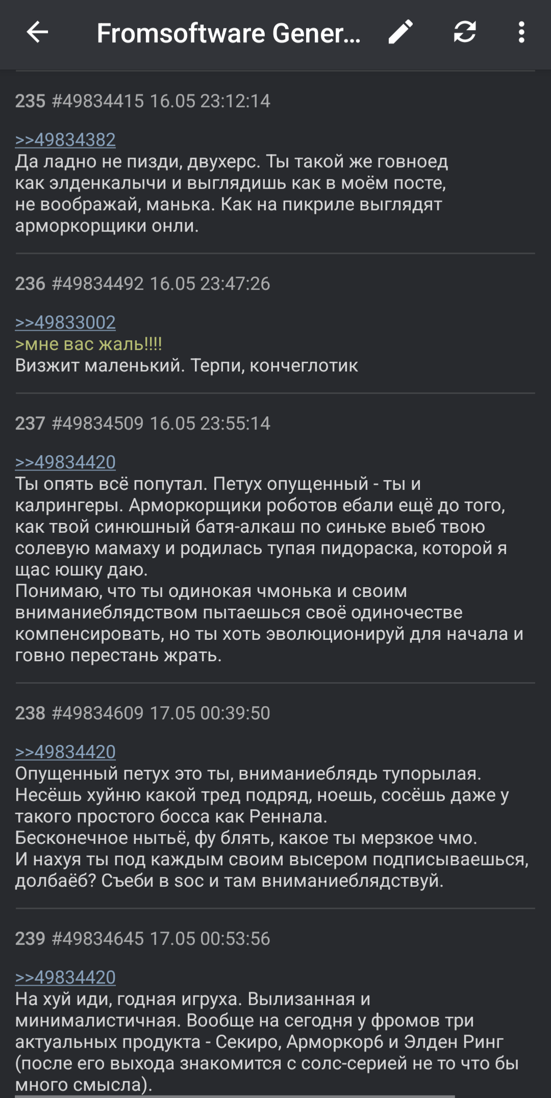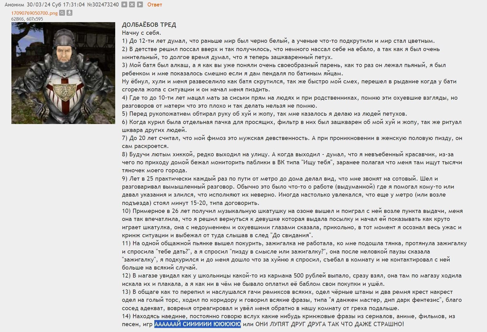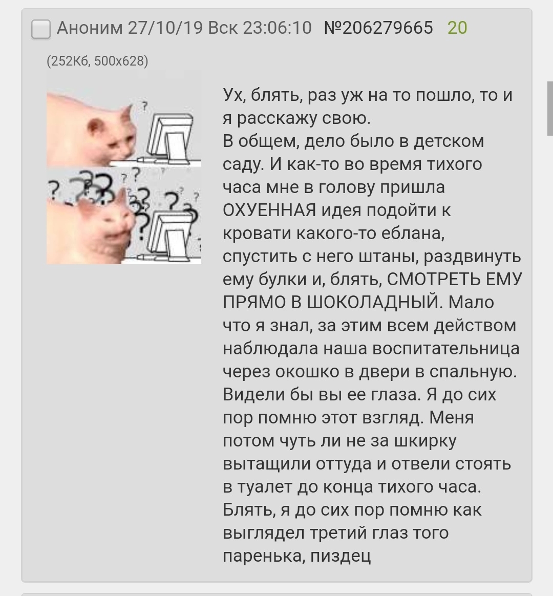 Эти треды невозможно читать. 99% тредшотов после ~2015 года - это юмор уровня имбецила (говно, моча, залупа). Борда, блядь, состоит из людей типа Максим Доши и Гамаз. И это не смешно.