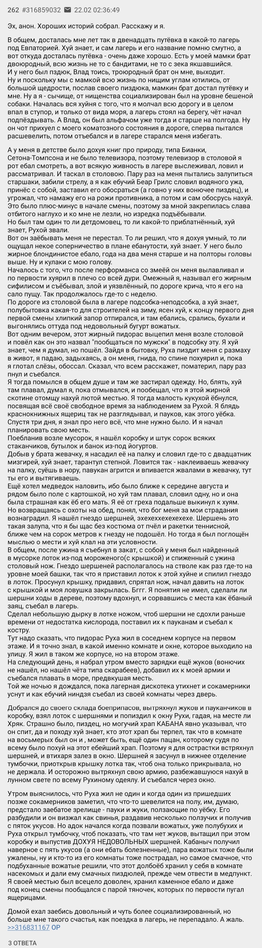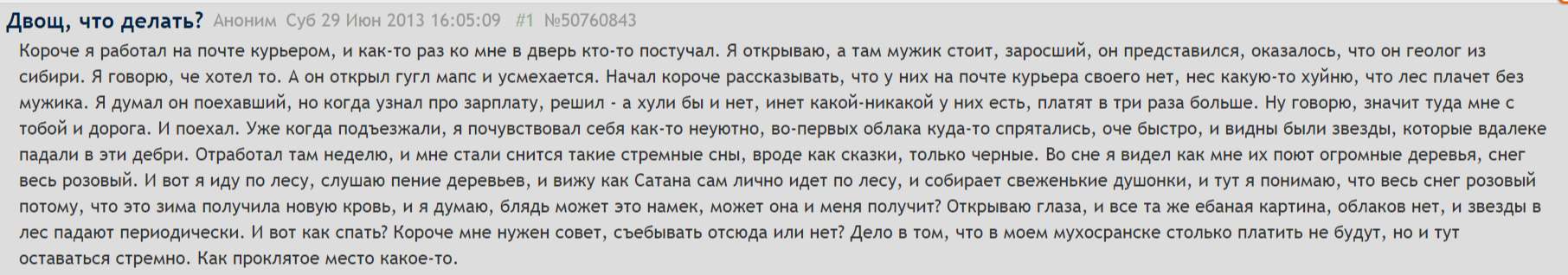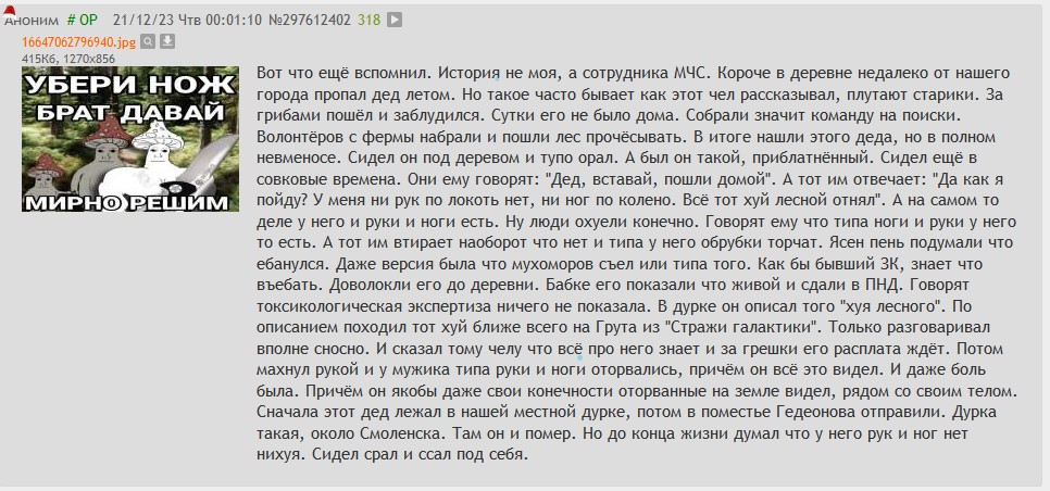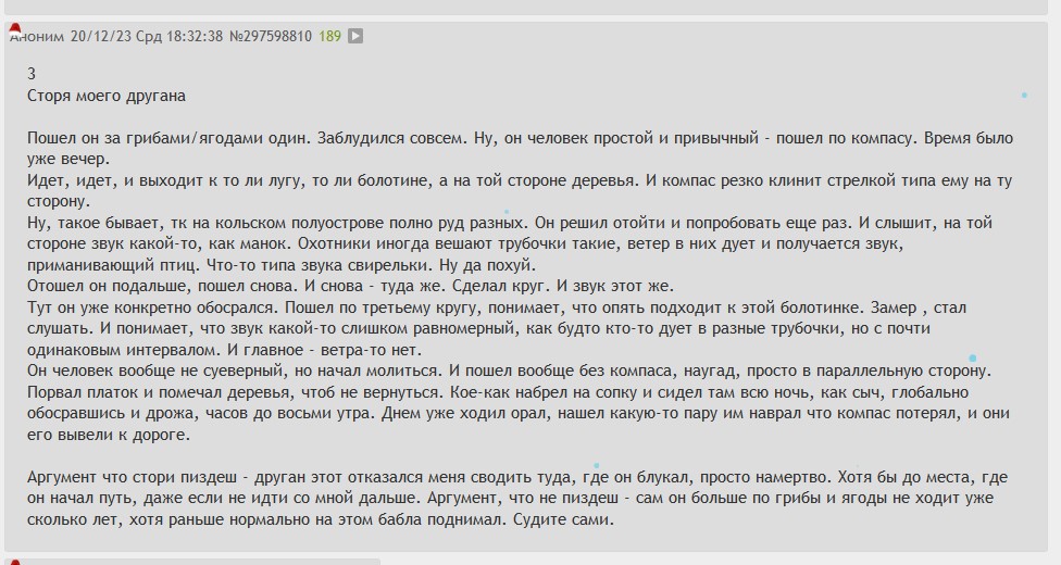Вот вы тут тредшоты про блуждания в лесу показываете, а люди-то реально ебанутые есть, у которых ориентация пространственная в жопе потерялась. Я вот в школе учился когда, пошли мы с другом одним в лес погулять. Гуляли туда-сюда между деревьев. Пора возвращаться стало. Я начинаю идти к дороге, а этот долбаёб мне в другую сторону указывает. И мы спорить начали. Пиздец просто, он ни за сторонами света не следил, ни ориентиры не искал, даже сука к ебучему звуку мкашин со стороны дороги не прислушался, а по нему ещё видно было, что пересираться начал, что заблудился. Я тогда испугался, что этот крендель решит пойти хуй знает куда, да мне за него отвечать придётся, но нет, со мной пошёл, вышли. Так он и подороге направление неправильное выбрать хотел, вышел бы не в город, а пошёл бы по трассе в поля. Я ему тогда так и сказал: с тобой больше в лес не хожу, ну тебя нахуй. Был бы этот долбаёб там сам, потом, может, охуительные истории рассказывал бы, как в тредшотах итт, а лес-то ведь был микрописечный.