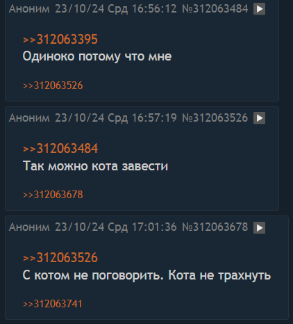 >>325691164 "успешная жизнь" - очень абстрактное понятие. и для каждого оно своё. я вот хочу доучиться и съебаться в село, где от бабушки дом достался, и жить один вдали от цивилизации, работая по тырнету, выбираясь в город за продуктами раз в неделю. для меня это будет очень успешная жизнь. ведь я буду счастлив. всяких миллионерах послушай, каждый второй в депрессии. Если у меня это получится, то няша позволит не ебануться при отсутствии общения. сейчас то я общаюсь с одногруппниками и семьёй, с кем живу.