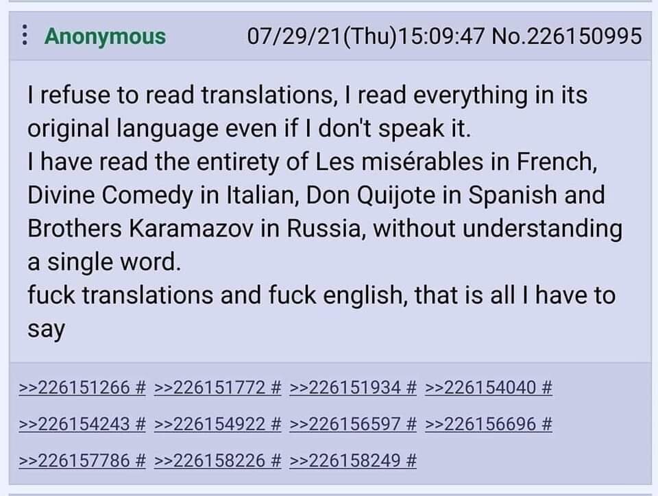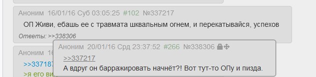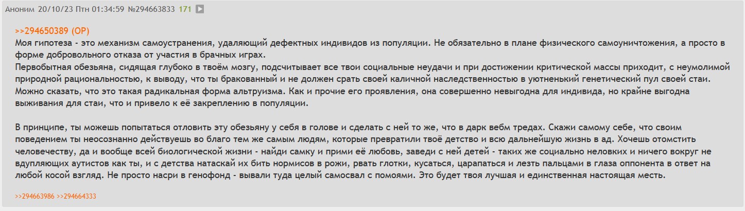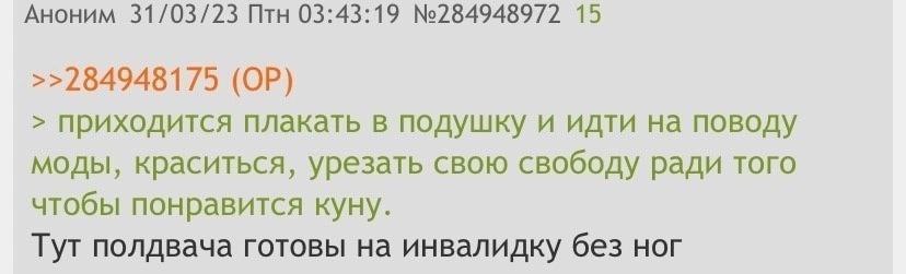 >>325655616 >А я напоминаю, что все кто используют чёрную тему являются быдлом и пикчи у них всегда несмешные. Им не до смеха, они пытаются найти себя в уникальности, которой нет. Возраста нехватает пока, чтобы понять. Быдло делает не в удобство себе, а в моду. Изъебнётся, будет кряхтеть, терпеть, лишь бы модна. Позже дойдет конечно, что всем похуй.