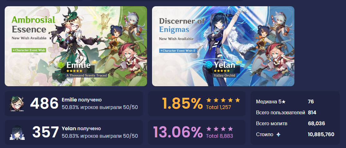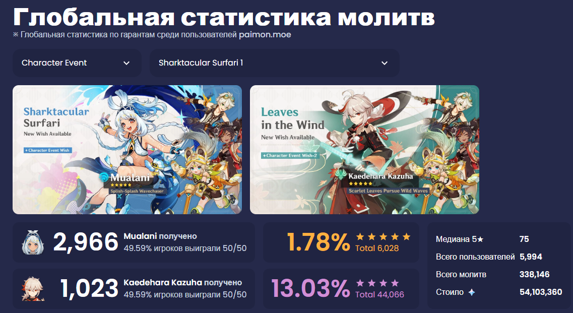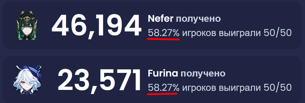 >>5867568 Я раньше тоже списывал на ошибку. Но проценты удивительно стабильны. Ниже 50% ни разу отклонений не было, да даже ниже 51% вроде не было. Даже если предположить что у многих уже будет набит гарант на нужный банер. То значит что в каком то раннем банере до этого они проиграли, а значит на том банере стата должна автоматом просесть. Либо, возможно, даже набитый гарант сайт будет засчитывать в луз 50/50 на текущем банере.