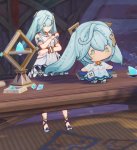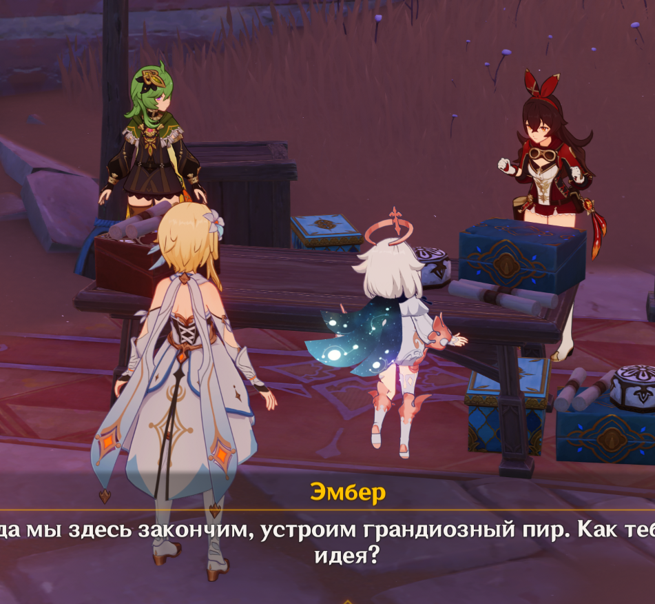 Забавно. Два пустынника смотрят на хиличурла, видимо хотят отнять его сундук. Хиличурл бьёт дубиной по земле, видимо угрожая, что не отдаст сундук... Они даже не догадываются, что сундук получу Я!