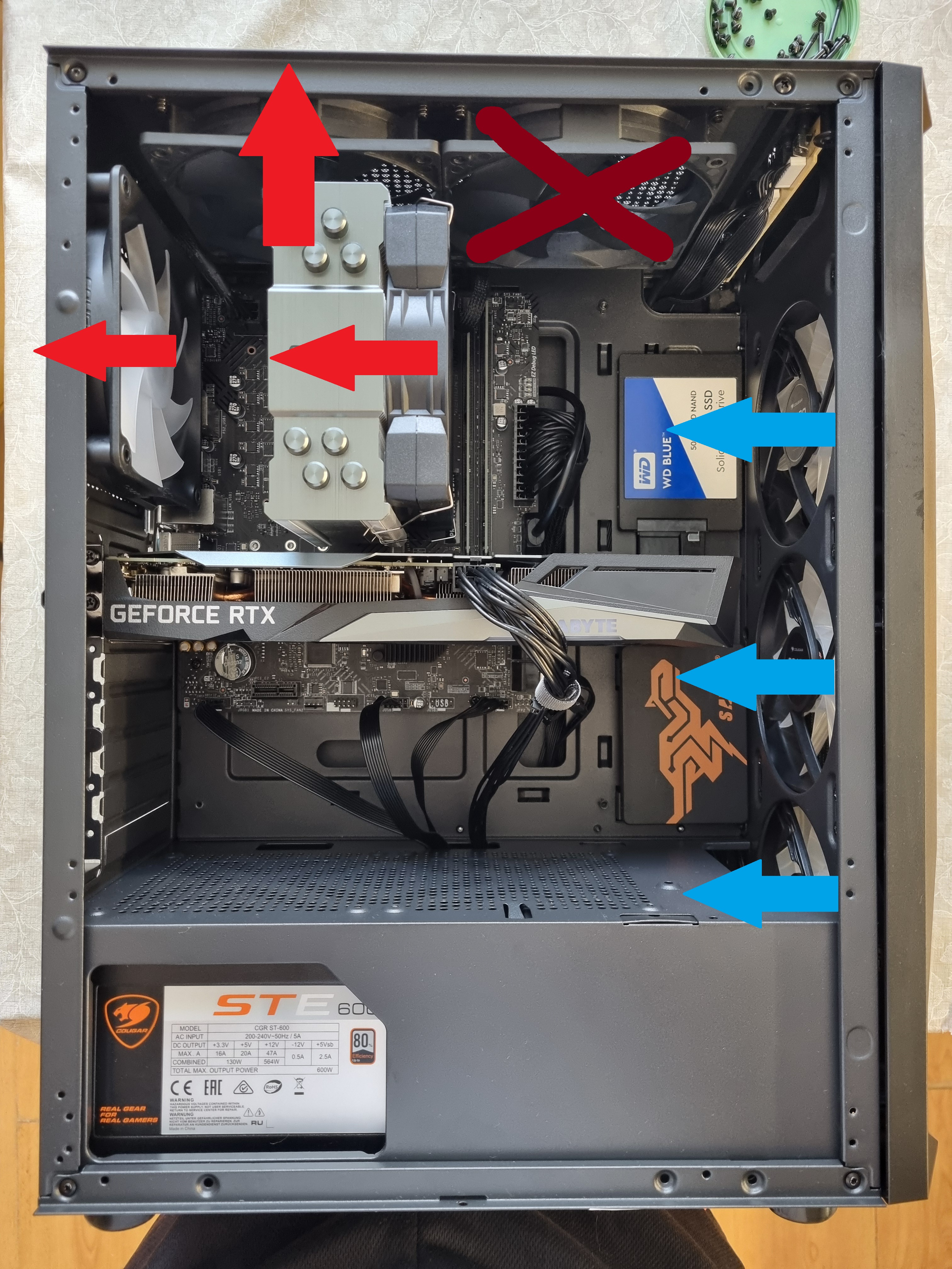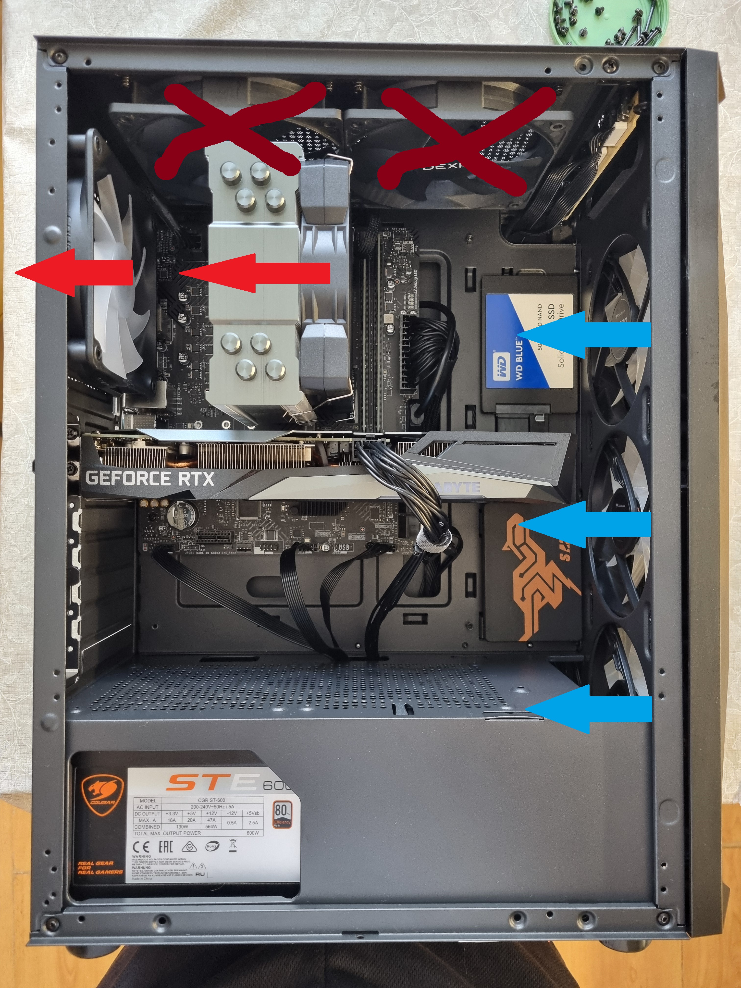 >>7546335 Непонятная хуета. На всех вентиляторах есть стрелочки, куда направлен поток воздуха. Физику не наебешь, снизу холодный воздух, сверху горячий
