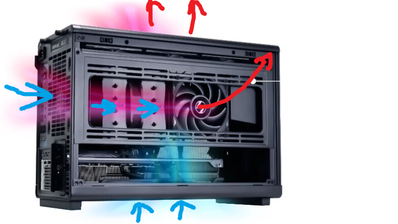 Имеется корпус lian li a3 matx Охлаждается как на пике. Два 120 снизу(вдув), два 120 сверху(выдув) и по одному 120 сзади(выдув) и сбоку(вдув). Так вот, на среддите предлагают охлаждение со вдувом сзади, перестановкой кулеров на проце тоже на вдув сзади и с выдувом сбоку и сверху(второй пик с безумными умениями). Как думаете насколько рабочая схема?