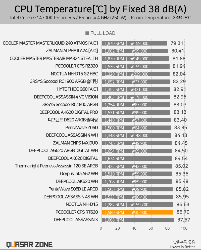 4 часа стресс-тест Аиды. Тишина полнейшая, только вялый бульк при запуске пеки. 57 градусов максимум, 7800x3d. Настройки автоматические. C башней AG620 в среднем 75 было.