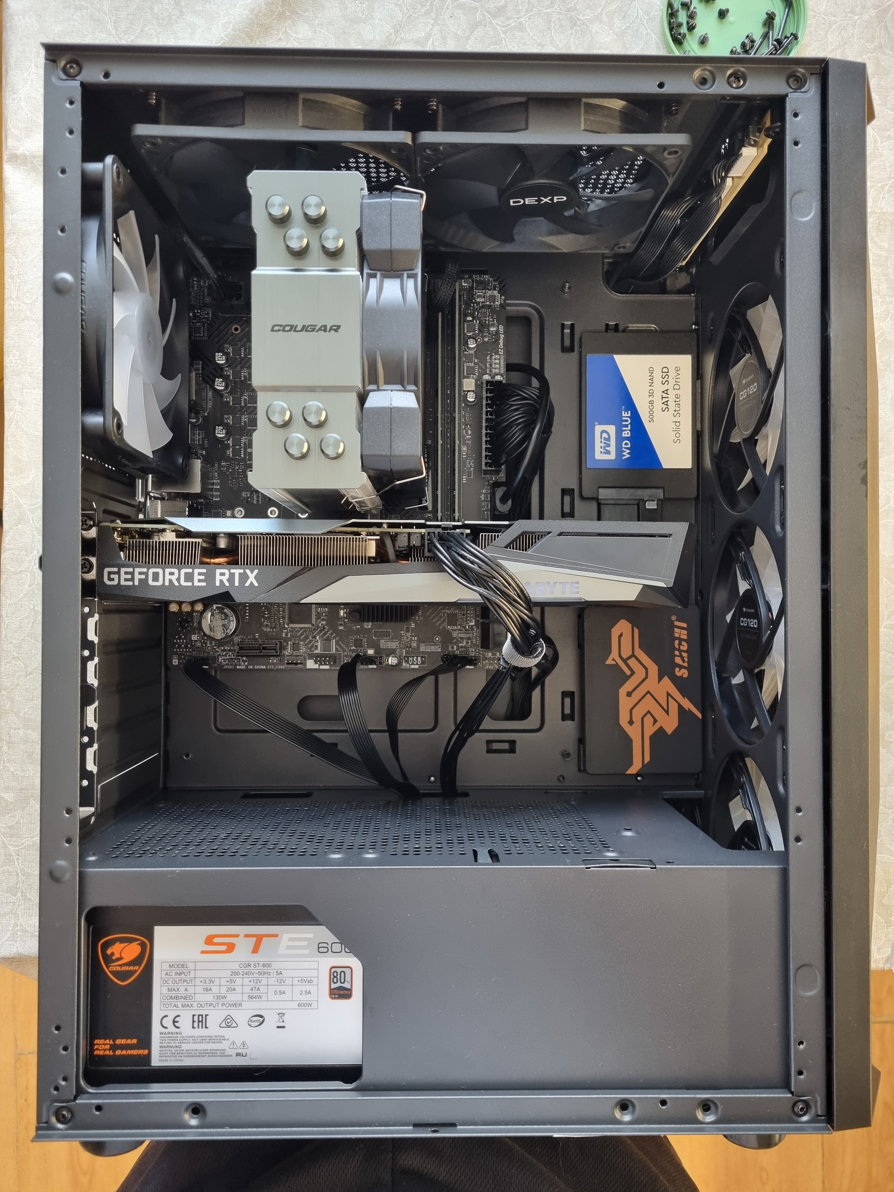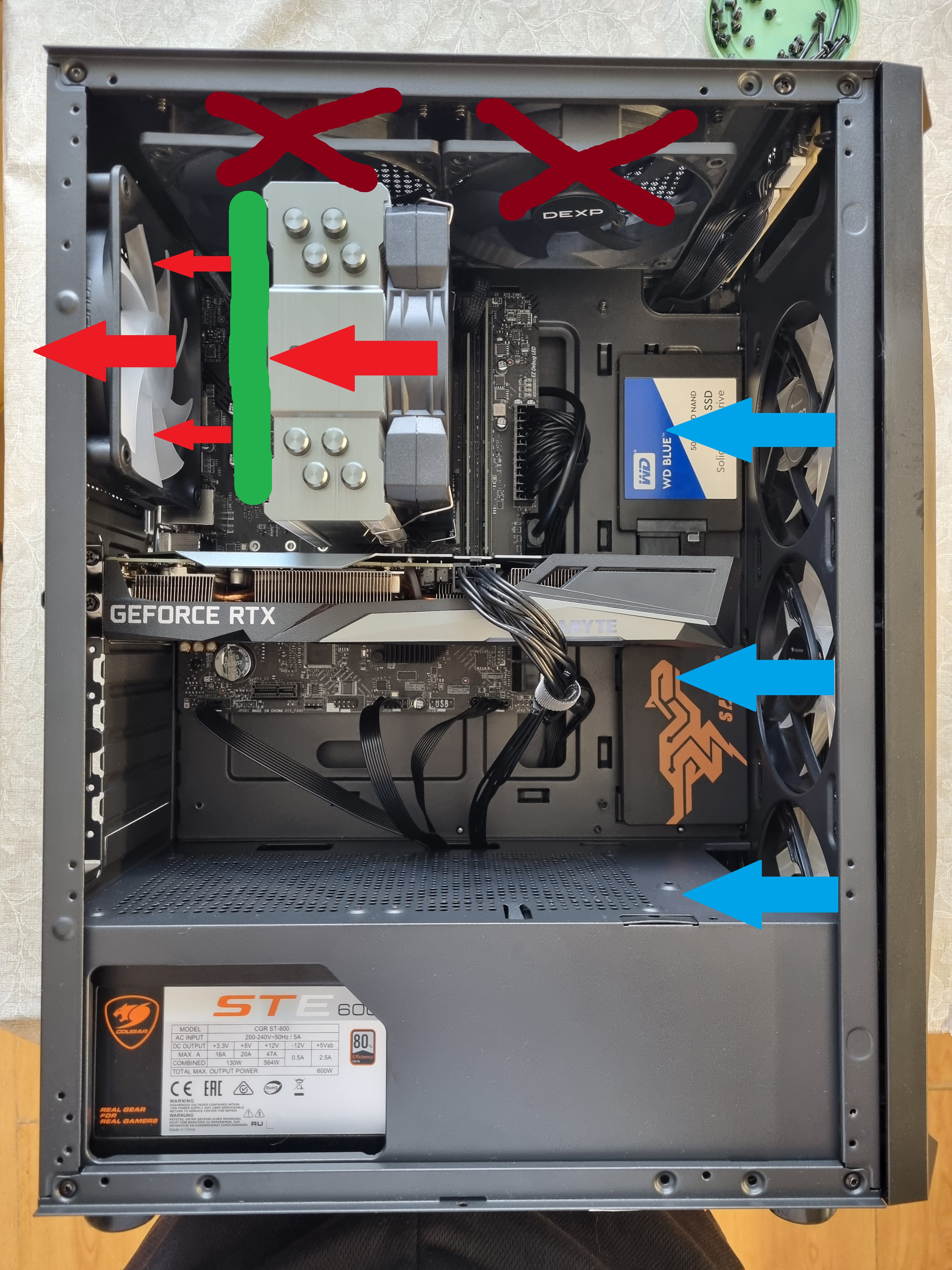 Что скажете про комплектные вертушки Cougar CR120? Что картонка в простое что ссд под радиатором горячие постоянно. Даже на максимальных 1000 оборотах поток от заднего ощущается пальцами лишь на 2см от задней панели.