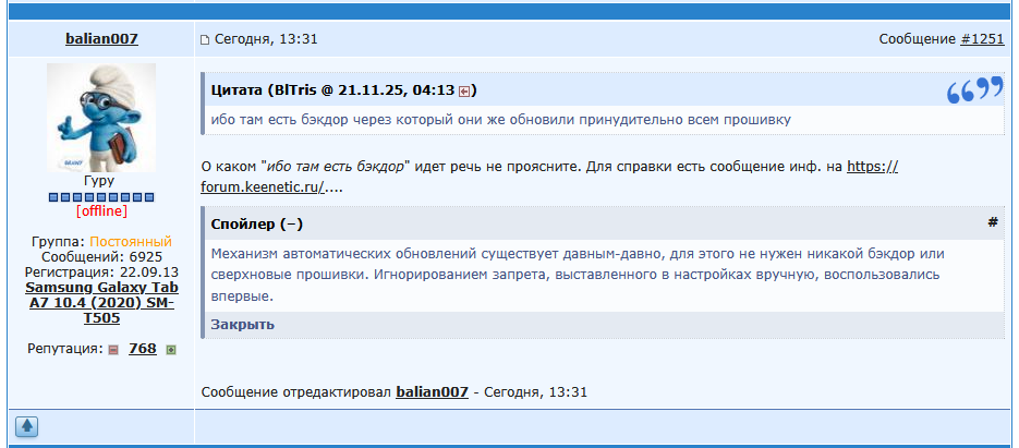 >>7539524 → Предчувствие не обмануло. Следуя популярной ныне практике, ПИДАРЫ проигнорировали отключение автообновления. В фоне всё равно его подтянули и тайком поставили. 3-й пикрил, персонаж слева - пользователь KEENETIC, отключивший обновы. На какой хуй там вообще эта настройка - непонятно.