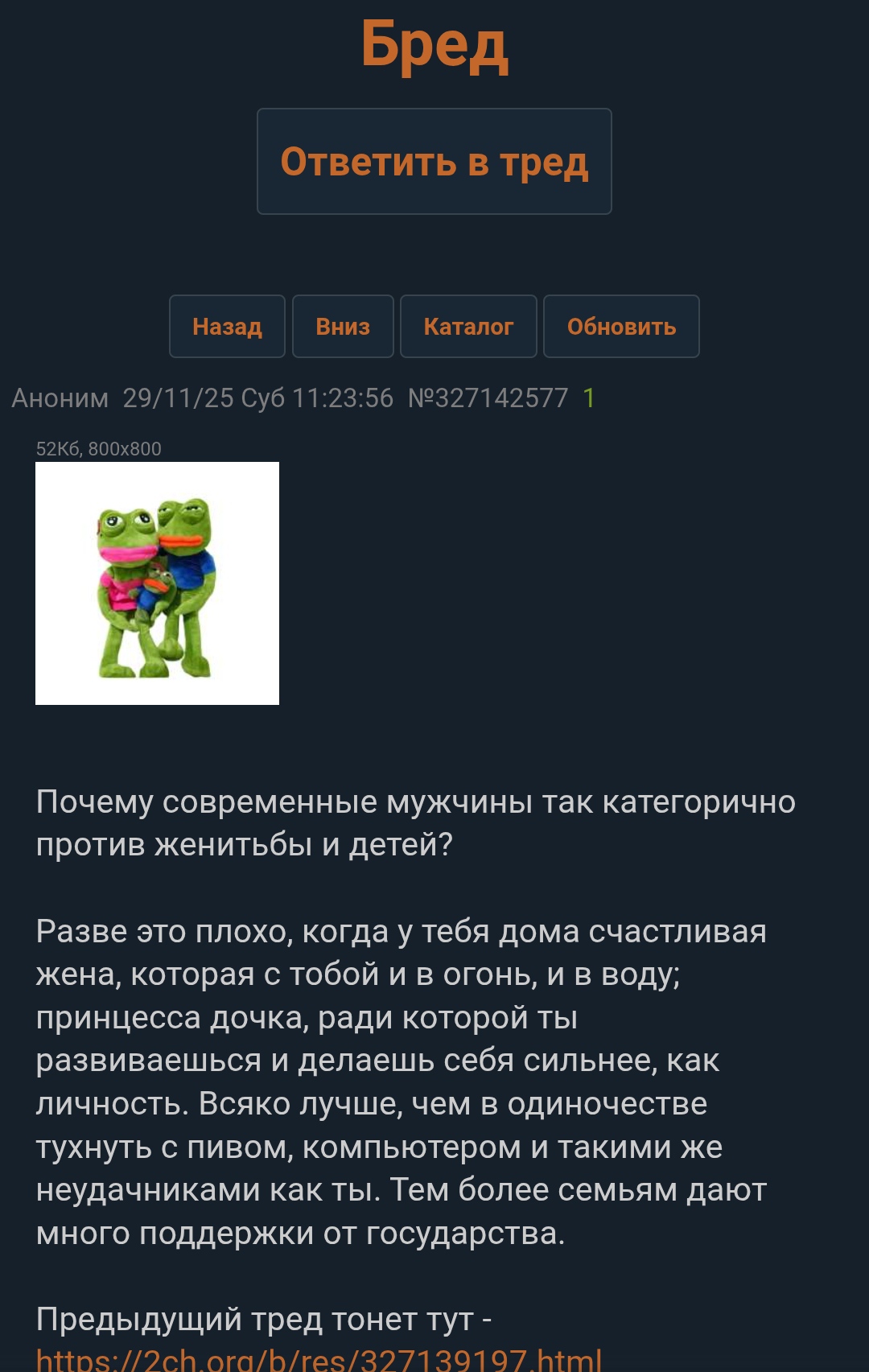 >>327218543 (OP) Хуй знает. Все женатики которых я знаю либо в разводах либо сруться как не в себя. Особенно соседи сверху. Сука каждый вечер с 7 до 10 ругаются как по расписанию. Раньше срались и после 10 но я пару раз к ним ментов вызывал и они вроде научились затыкаться. Знаю еще чела который спился в браке и умер. Я у него на свадьбе еще пиздюком был. А еще знаю двух работяг которым я по выходным ролевки в гараже вожу потому что они домой возвращатся не хотят. И при этом все кого из женатиков ирл я знаю изменяют. Пиздец мне иногда кажется что счастливая семья бывает только в раскаазх плодячколахты, аниме и у меня с моей воображаемовй вайфу.