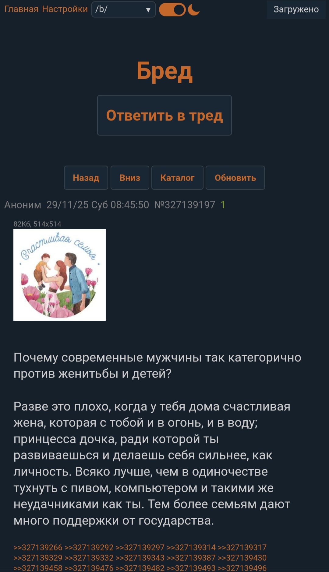>>327218543 (OP) В реалиях всж не может быть счастливой семьи. Особенно если роль женщины в ней выполняет Наташка, выросшая в безотцовщине. Женатик всегда идиот, запомните это.