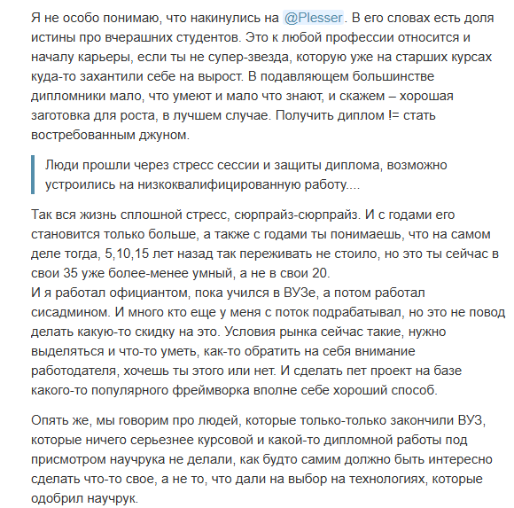 У джунов ситуация ещё хуже — у работодателя нет ресурсов выращивать новичков и растить их внутри компании. Раньше могли набирать выпускников онлайн-курсов «пучком» за небольшие деньги и через пару месяцев вынимать из этой массы пару нормальных спецов. После 2022 года эта модель стала экономически невыгодной.