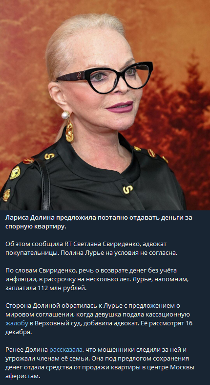 В ноябре суд оставил квартиру Ларисы Долиной, которую певица продала под влиянием мошенников, в собственности артистки. При этом покупательнице, Полине Лурье, деньги не вернули, а ее иск был отклонен. Это вызвало общественный резонанс, который уже прозвали в СМИ «эффектом Долиной». Ряд звезд встали на сторону народной артистки России, а некоторые, наоборот, выступили с критикой в ее адрес.