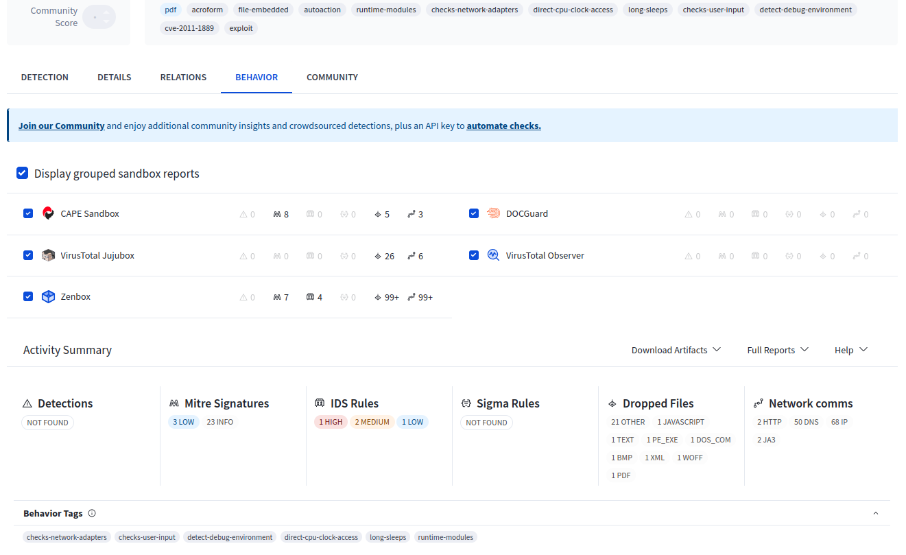 >>3579175 >Какие еще вирусов нахуй. Обычные. По кд попадаю на зараженные пдф файлы книг по программированию с либгена. Прогоняю перед запуском на вирустотале и каспере. Иногда не детектируются антивирусами, но вирустотал умеет еще прогонять в песочнице на MITM атаки и там по кд детект отрабатывает