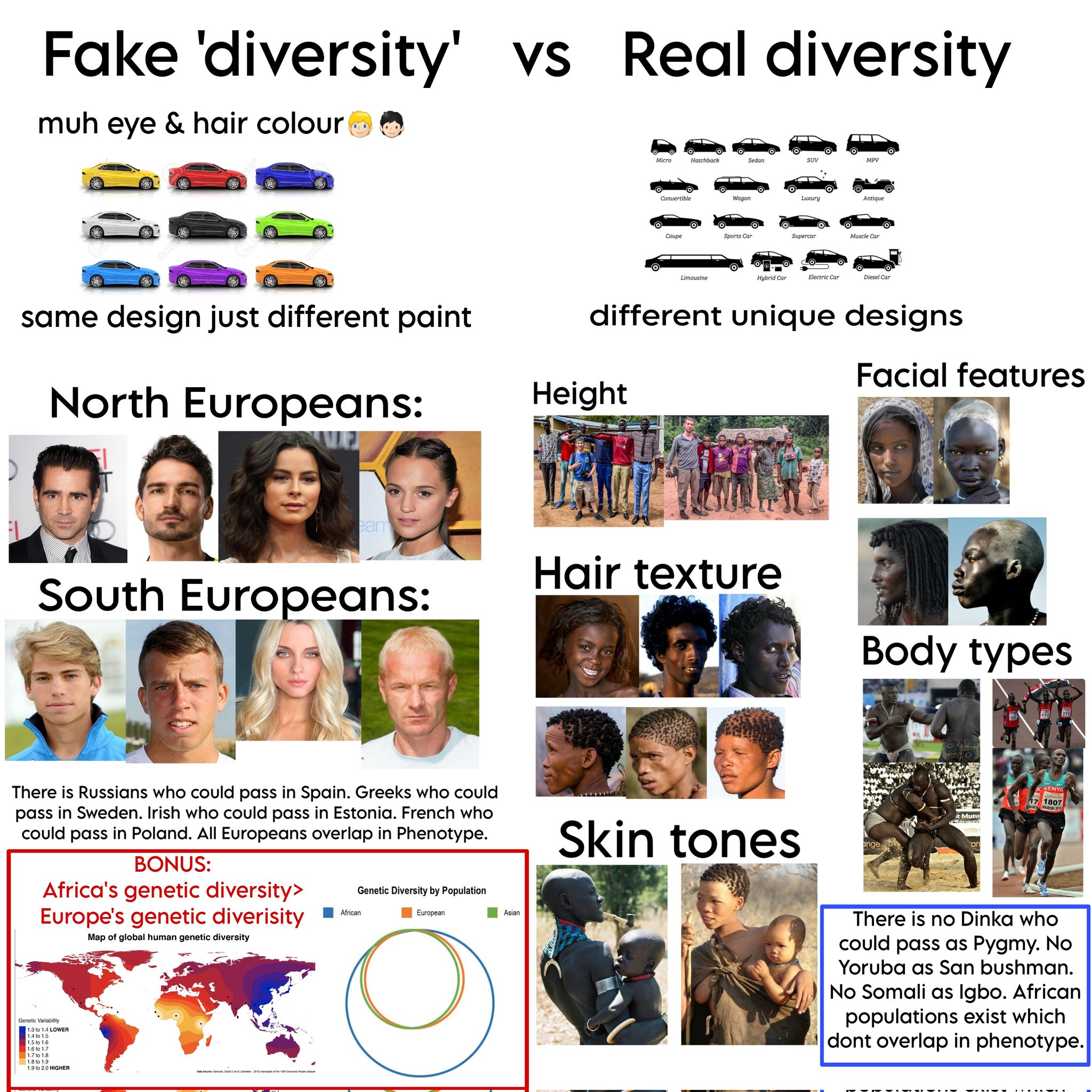 В rs12913832 1-2 аллеля поменять с А на G, сломается выработка меланина в глазах и человек будет светлоглазым. Теперь попробуйте так просто изменить интеллект, рост, черты лица, текстуру волос и прочие реально расовые признаки.
