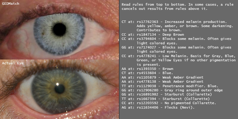 Не будет, цвет глаз не одним геном кодируется. Вот например раньше в гедматче был eye color predictor который выдавал твой цвет глаз (на пикче сверху, снизу - настоящее фото), вот пример снипов которые он анализировал