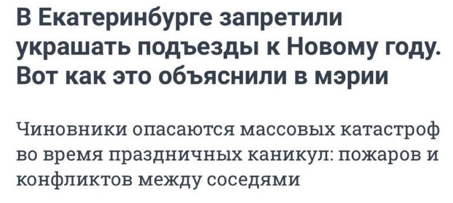 А вот и последовала реакция на недавний скандал, который устроил точик из-за новогодней елки в одном из московских ЖК. Мэрия Екатеринбурга запретилиа украшать подъезды к Новому году, чтобы не было конфликтов между соседями. 4 декабря на совещании в администрации мэр Екатеринбурга Алексей Орлов, обсуждая новогоднее оформление города, поручил главам районов запретить жителям Екатеринбурга украшать подъезды многоквартирных домов. Необходимо строго контролировать этот вопрос— поступает много жалоб. Никаких гирлянд и игрушек,подчеркнул Орлов. Кто именно жалуется на украшения в подъездах к Новому году — мэр уточнять не стал. За несанкционированное украшени предусмотрены и штрафы. Для жильцов от 5000 до 15000 рублей. Для управляющей компании от 300000 рублей. Кроме того, для украшения подъезда потребуется согласие всех жителей дома. В случае жалоб на новогодние декорации может быть наложен дополнительный штраф— от 100 до 300 рублей. Пыпа, итоги.