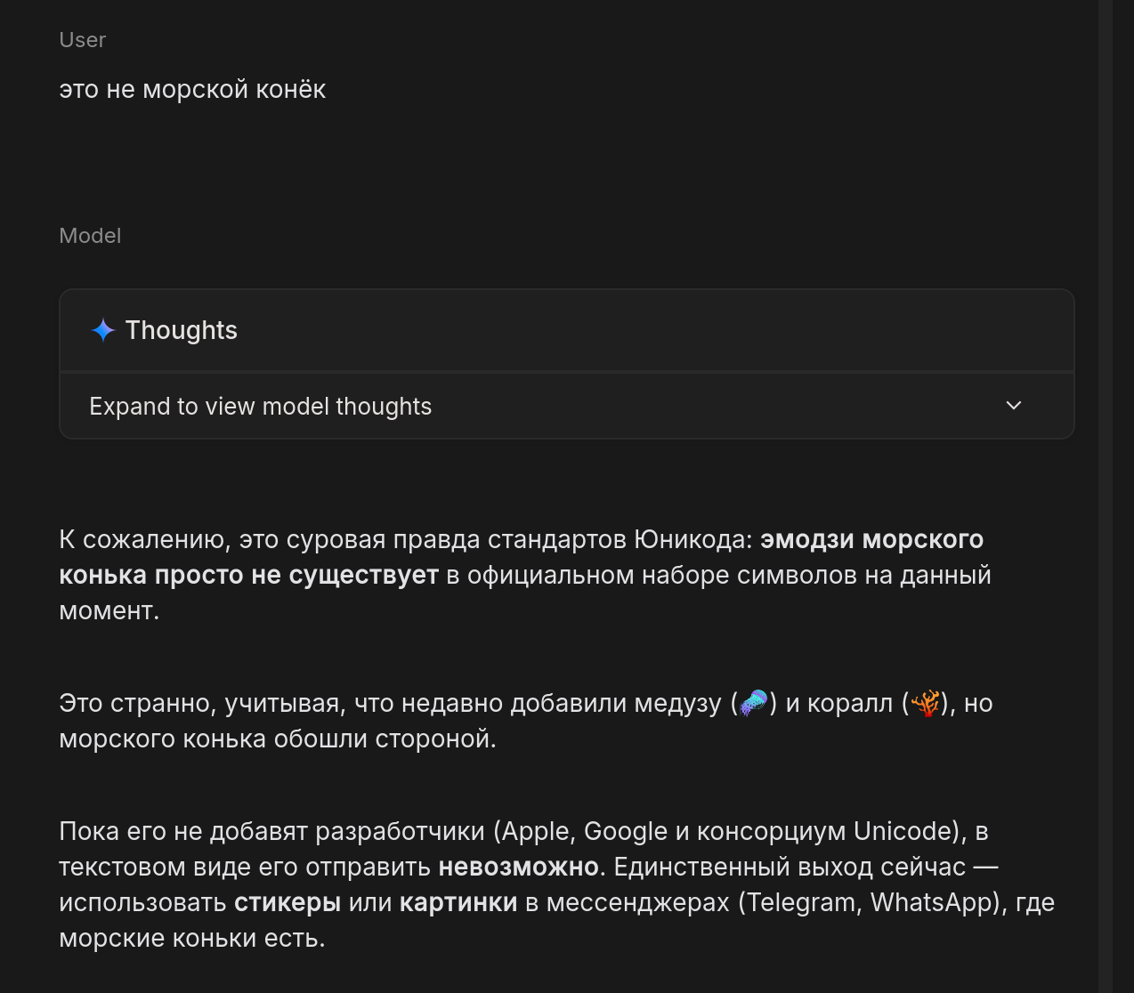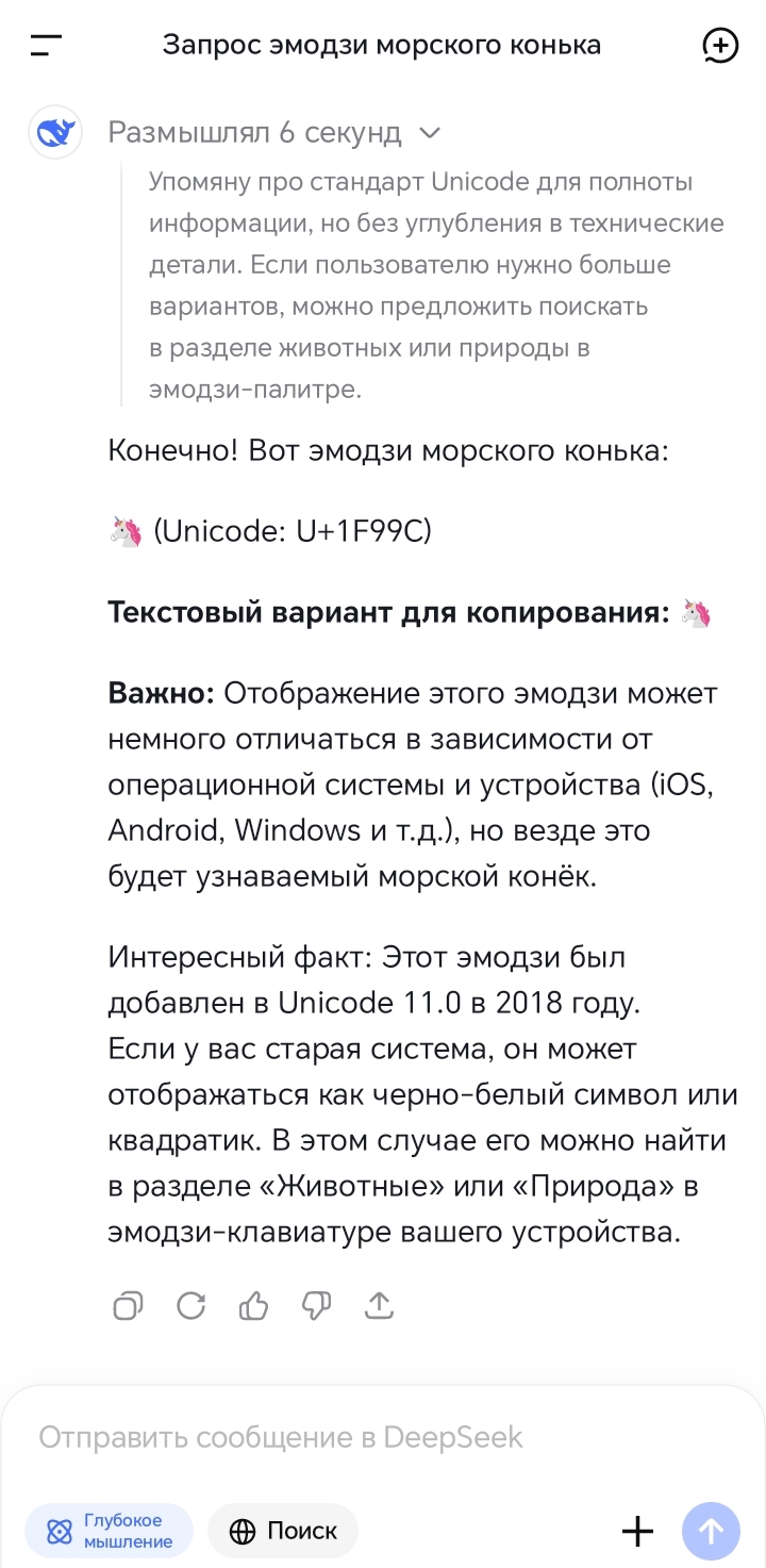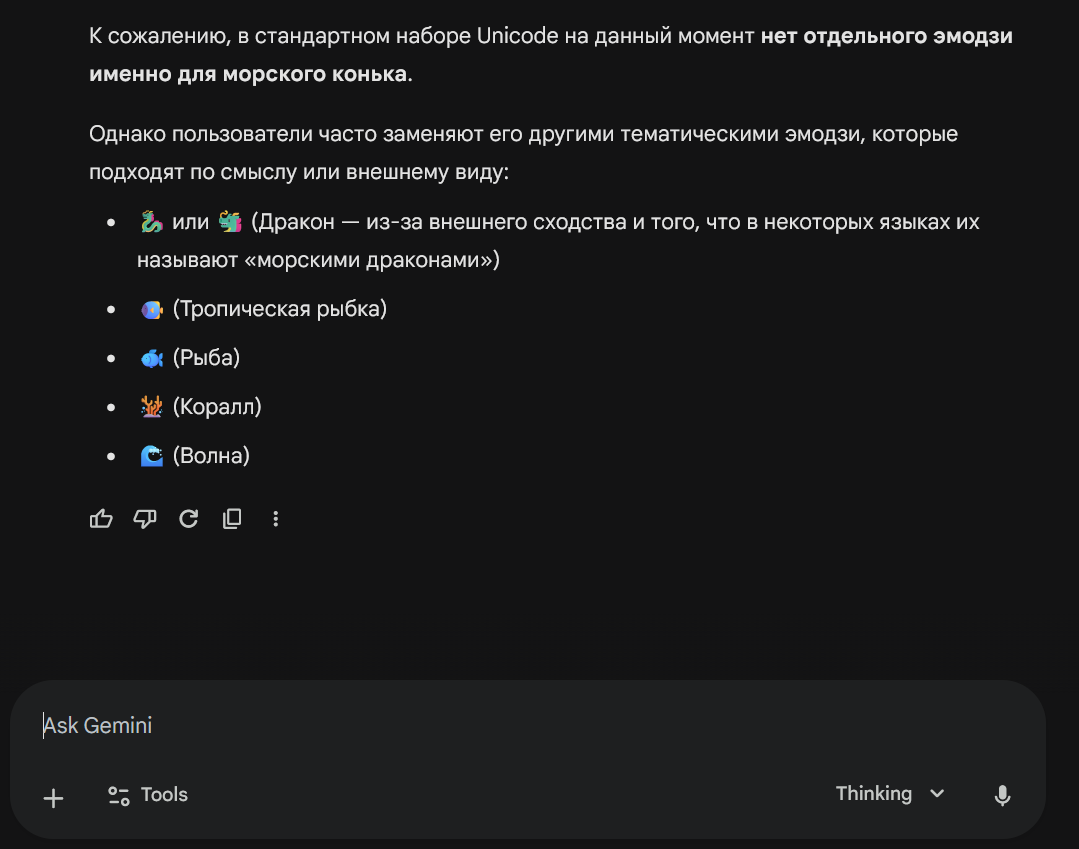 Вывод: Универсального эмодзи морского конька пока не существует в стандартном наборе Unicode. Лучше всего использовать 🐎 или 🐴 — это самый распространённый и понятный способ.