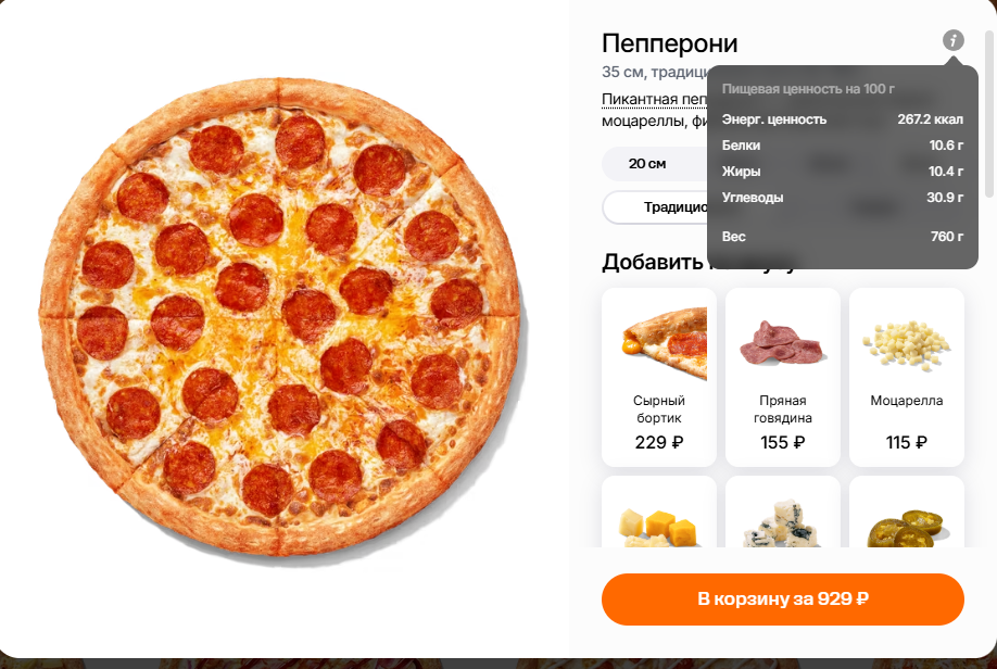 >>327342310 Ты чёт перепутал Вот стандартная пицца из Додо (похуй, на самом деле откуда, оно всё +- по бжу и весу одинаковое). Стоит 1к как раз 2к калорий получается, т.е. по сути норма хумана с умеренно-подвижным образом жизни. Но естественно сожрав это всё в одно ебало за один прием пищи, захочется ищо (хотя в целом если чел способен на это, то он либо жиробасина, либо кочка).
