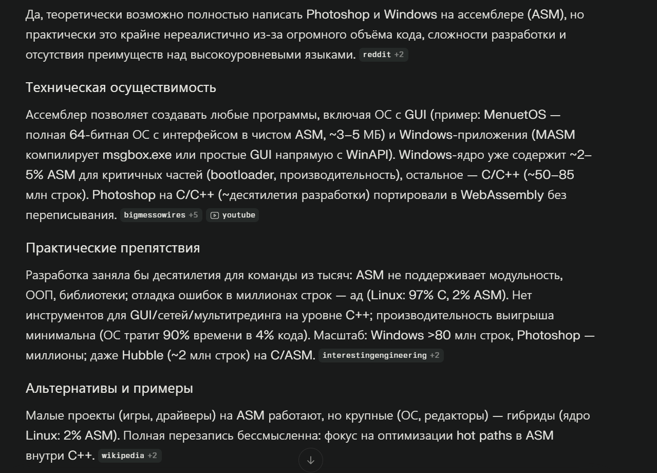 Да, фотошоп стоил бы 100 т.р. А игрулька 3d от 50 т.р. Программы редактирования видео по разному. В зависимости от кодеков функций и прочего. Адобские могли бы стоить от 100к за 1 программу премьер афтер эфект. Ну надо понять они бы не весели гигабайты. По 500 мегов. Потому что оптимизированные. И установка просто копирование на диск программы. А код запуска в свойствах файла. "Windows" весил бы до 700 мегабайт. ПО загружается сразу в память и запускается. ОДНИМ ФАЙЛОМ. То есть на архитекторе этой основная масса ПО x86. 4 гига хватает ВСЕМ. А добавочная память известная (расширенная) под ДРМ идет (программистам лично свое сделать это же комп) она для этого и нужна. 64 не используется. Разве под сервера. Это дибилизм неоптимизированных программ. Я выше написал белочки несуны с работы тащат. Какие-то 90-е. Нарушения. Ну это двуполые критины, хотя мог быть коммунизм. Там чуть похоже. Обычные типа программы фото убрать там прыщи это простые и даже бесплатные могли быть.
