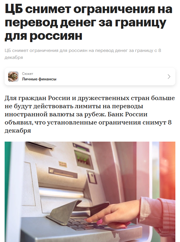 >>61356034 (OP) >>61356055 >Банк России с 8 декабря снимает ограничения на перевод средств за рубеж для граждан России и дружественных стран Патриотизм - патриотизмом, а обед по расписанию.