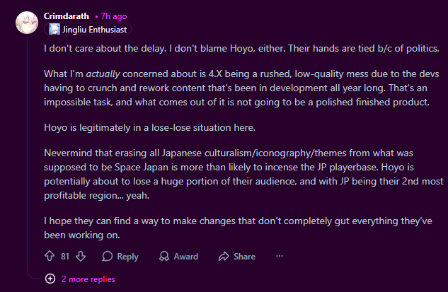 Мое копиумное предположение: переписывания всей планеты не будет, патч перенесли чтобы попасть на китайский новый год и под него выпустить китайского перса, таким образом максимально сместить акцент с последующего японского региона и баннера Искорки во второй половине. Переработки дизайнов или не будет, или будет минимальный, две недели это слишком малый срок для такой огромной работы. Задержка по большей части связана из-за изменения порядка выпуска персонажей и слегка измененного сюжета из-за пуша китайского перса вперед.