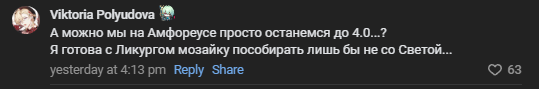 Последняя версия патча. И такой мусор 😐 объективно. Какая-то баба, которая вся такая типичная мамми для гг. Опять нытье светы. Какие-то персонажи, которые будут лить в уши непонятно что. И Авантюрин. Он выглядит как алмаз среди навоза в этом тизере. Какая интересная версия была с Раппой. Эти бананы, обезьяны, бутхилл отжигал, стекольная история Раппы, и в целом было весело. А это что? Скатилось все до облизывания гг, сиськобабы и нытья очередной пикми тянки т_т Я надеялась что Река все таки станет игровым под конец патча. А не. Зачем? Давайте сделаем бабень, которая будет краснеть и трясти всем что есть. Так же оно ж да... И можете говорить что угодно, но я разочарована. Я любила хср, а он скатился до низкосортного подтирания инфелов 😥
