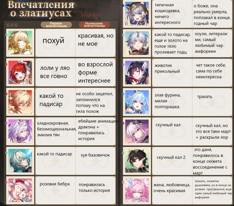 Ляо испортил Дашку сделав ее слишком кумерской. Ничему его ззз не научил. Ещё и выдал ее в пачку Светы и Фуги, все тот же низкий трюк с лисом для Ахерон. Не крутил мужиков? Теперь крути для своей Ахерон. Не крутил безвкусный кумерский слоп? Крути его теперь для своего брейка.