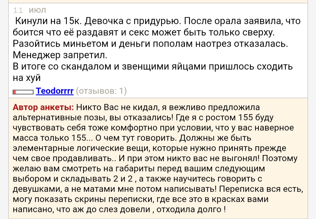 >>10452924 Бля как же ору когда такой срач в отзывах Ахахах я понимаю что это услуга все дела. Но как же кринжово когда они разборку ведут и в голове представляешь эту картину. Сам не раз в такие истории попадал. Просто забивал хуй. Смысл выжимать чето доказывать. Обычно пмшу так баба не очем коротко и чётко. Не советую тратить время.