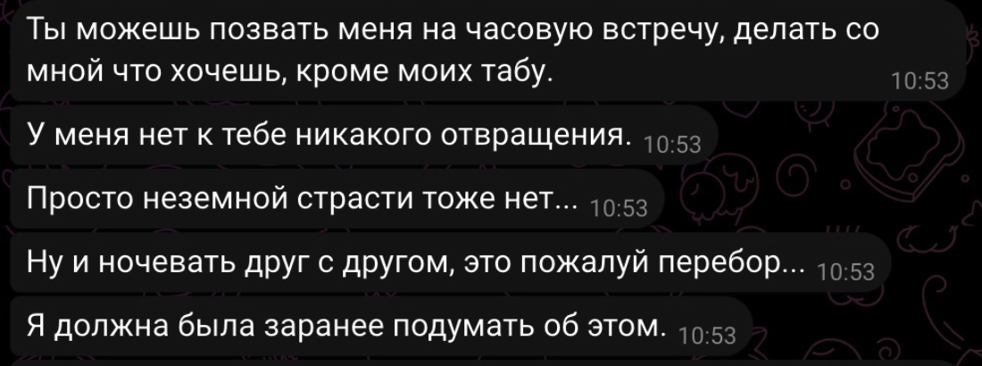 Тот который не смог приехать, но все-равно отправил 100к за встречу." с ТГ шлюхи.