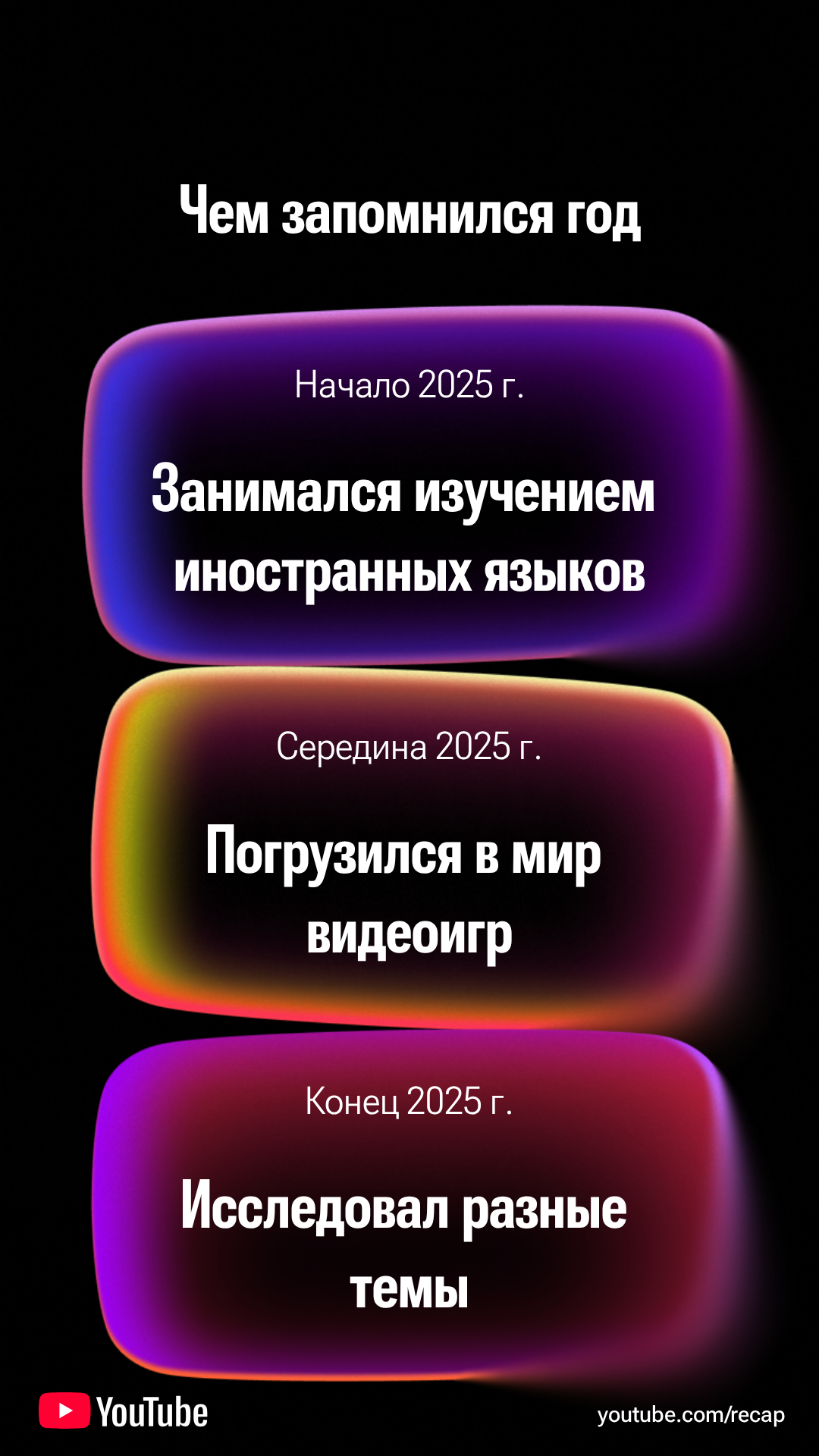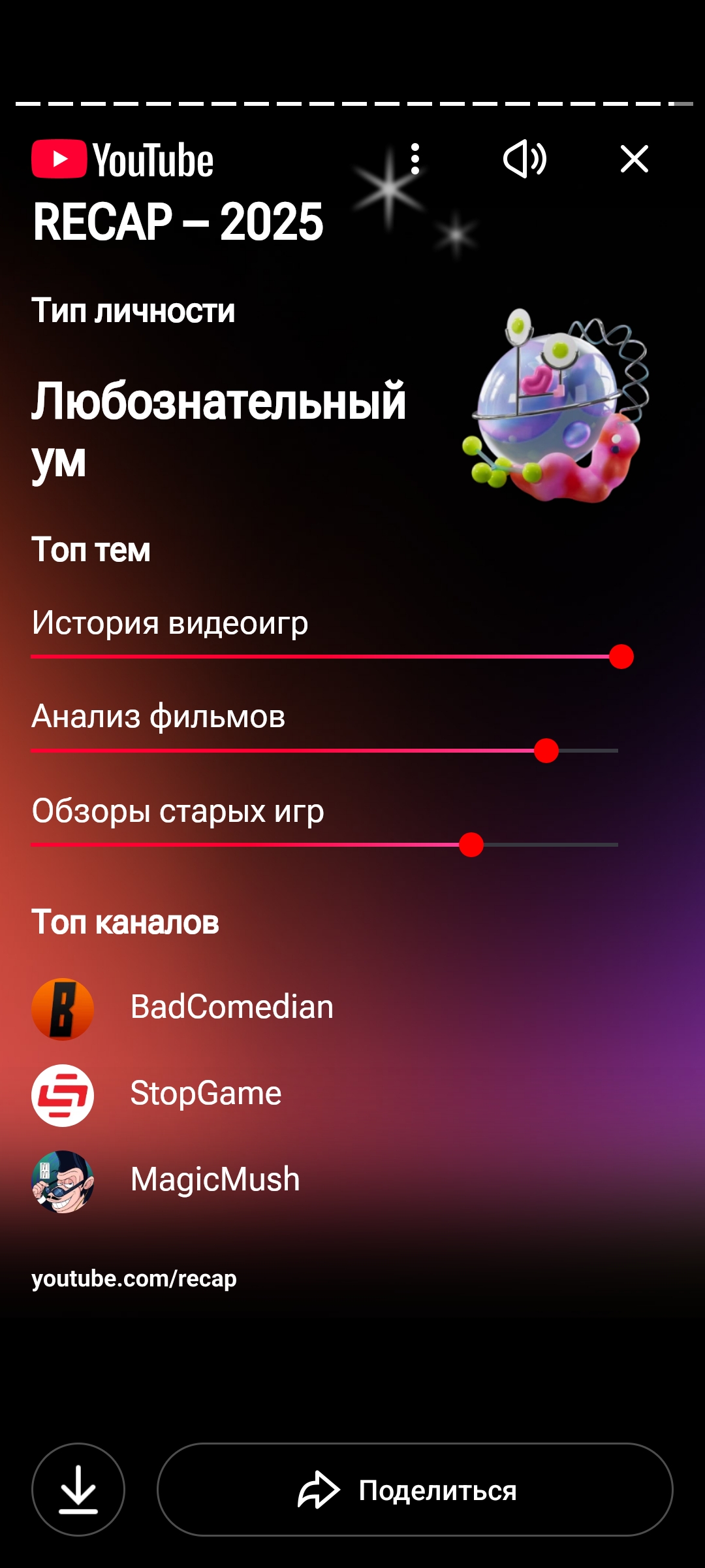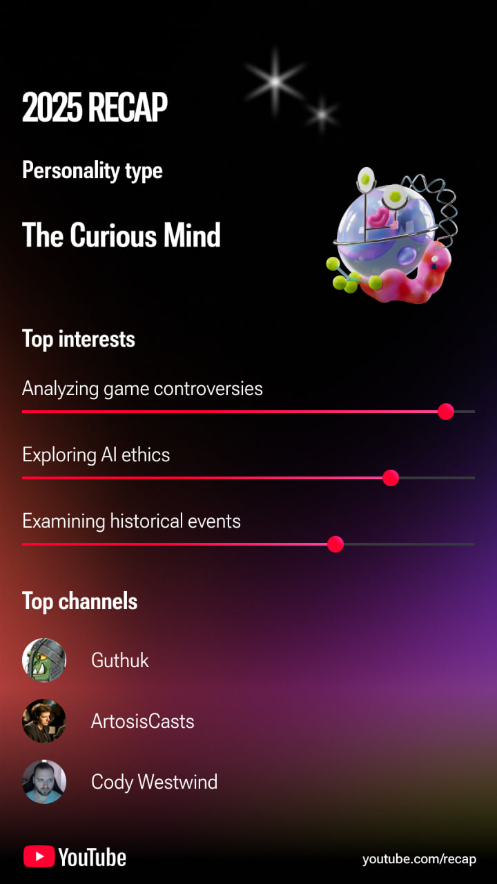 >>327395524 (OP) А где? Открыл приложение - не вижу. Открыл в браузере youtube.com/recap - он пишет "recap 2025 уже ждёт вас в приложении. Открыть приложение?" Жму кнопку "открыть" - открывает страницу моего профиля и всё.