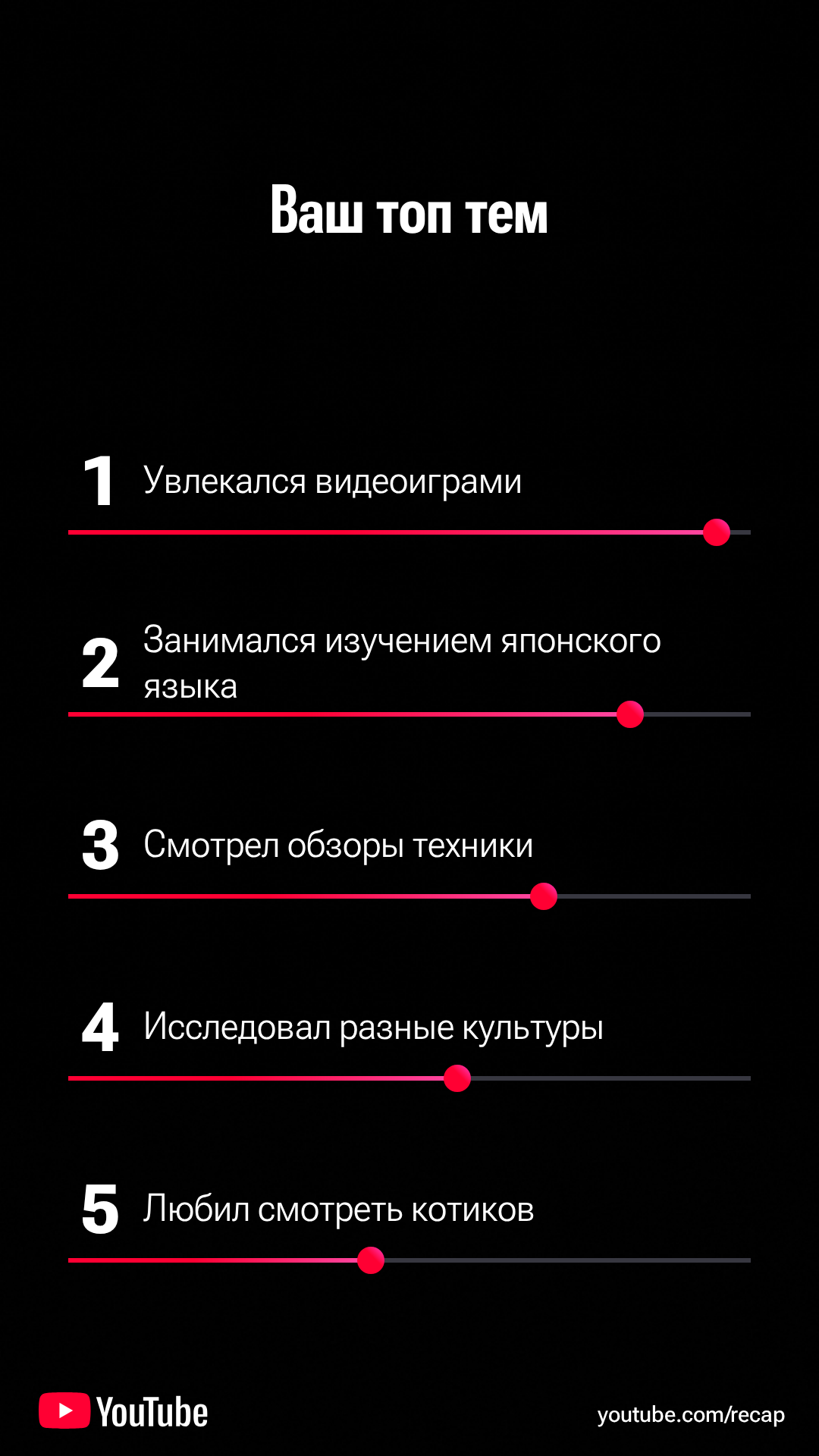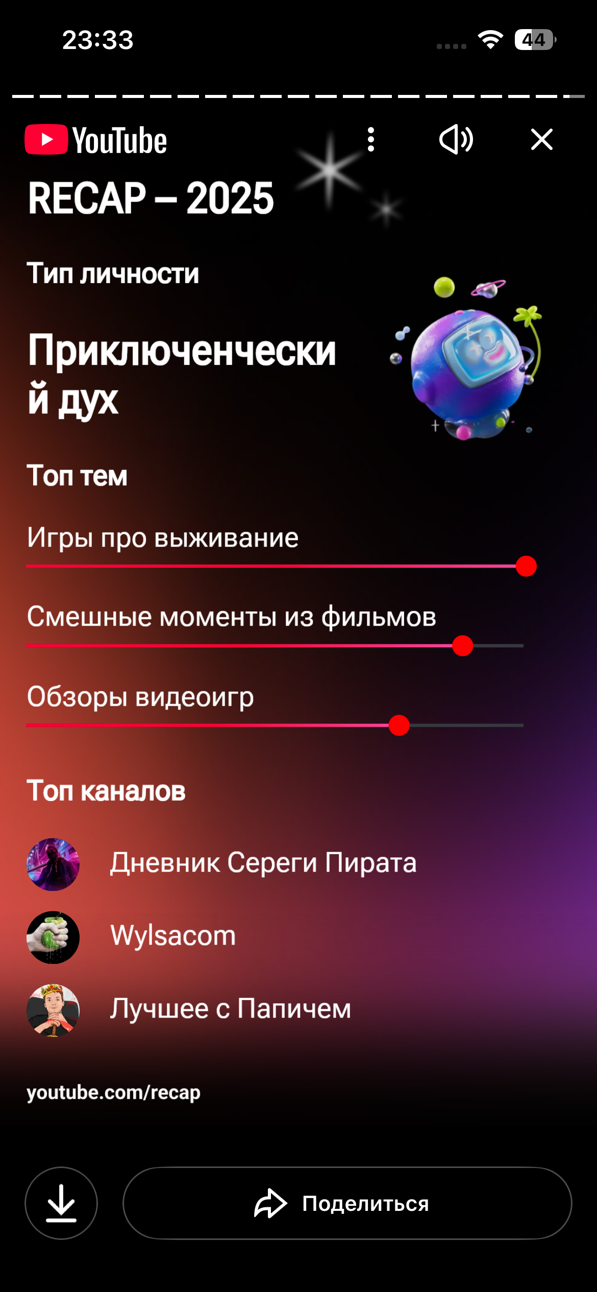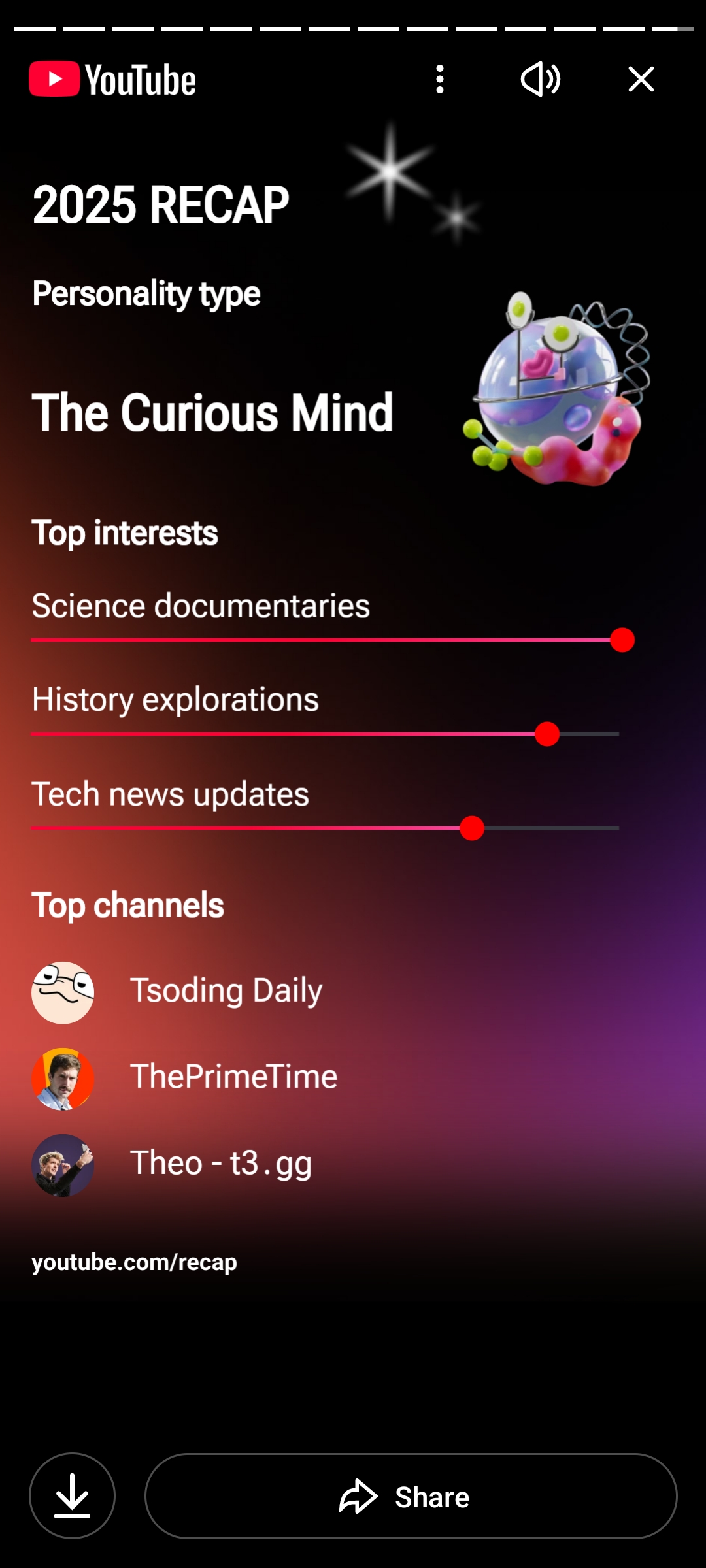 >>327395524 (OP) А где? Открыл приложение - не вижу. Открыл в браузере youtube.com/recap - он пишет "recap 2025 уже ждёт вас в приложении. Открыть приложение?" Жму кнопку "открыть" - открывает страницу моего профиля и всё.