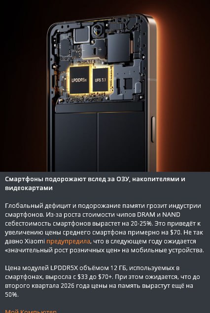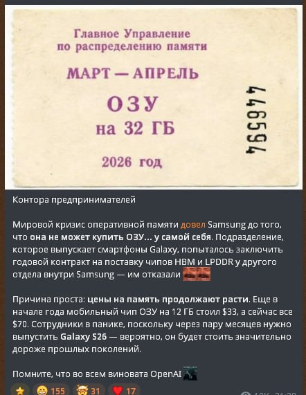 Любителей дешевых телефонов и взломок (aka КАЛДРОИДОВ) производители памяти ОФИЦИАЛЬНО кинули через хуй. Нищий рынок андроидов никому нахуй не всрался. ПОДРАЗДЕЛЕНИЕ САМСУНГА по производству чипов кинуло мобильное подразделение ради ШЕКЕЛЕЙ ОТ AI-КОРПОРАЦИЙ. Пик 1, 2. Все андроид трубки либо начнут клепать из пластика, либо цены взлетят на 30%.