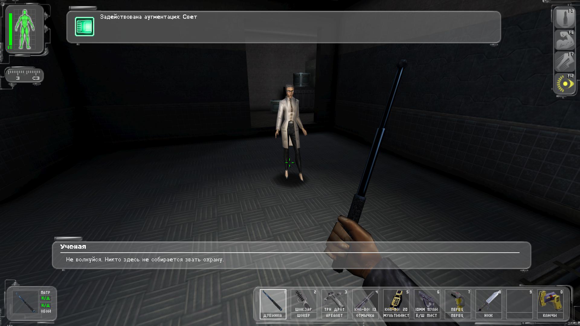 Загадка на миллион. Сидит чел в кресле. Решаешь вырубить его по стелсу по спины, все интуитивно понятно. Вырубаешь с первого удара, тебя вообще никто не видел, на мужика тоже никто не смотрел. Но ученые которые дружественны к гг замечают спиной твои проделки и бегут включать сигнализацию и предупреждать охрану. Стелс, понимать надо