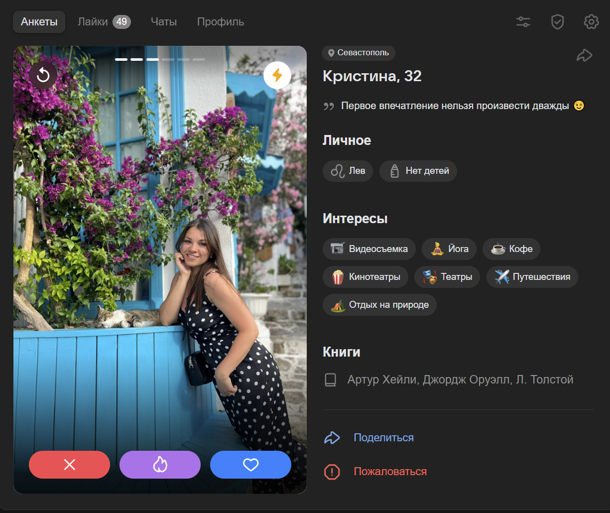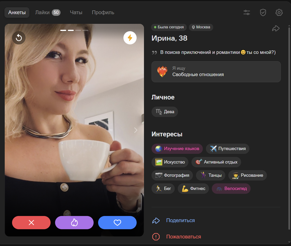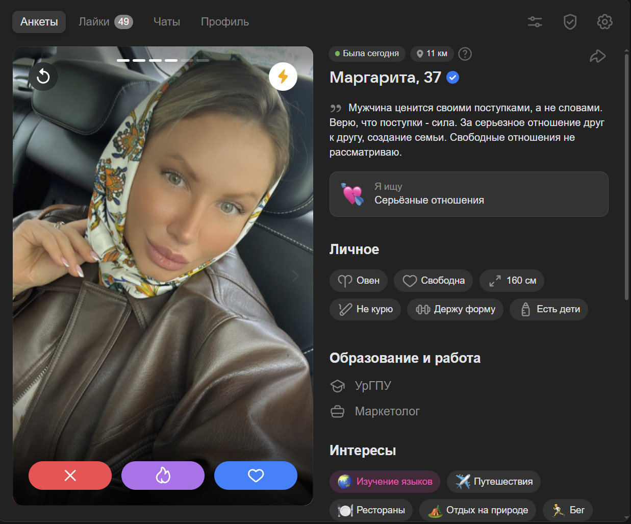я бы хотел из анкеты понять какой у тебя характер, ебанушка ли ты, какие у тебя ценности помимо ебучих путешествий, карбонары и новых впечатлений. ебучие нпц